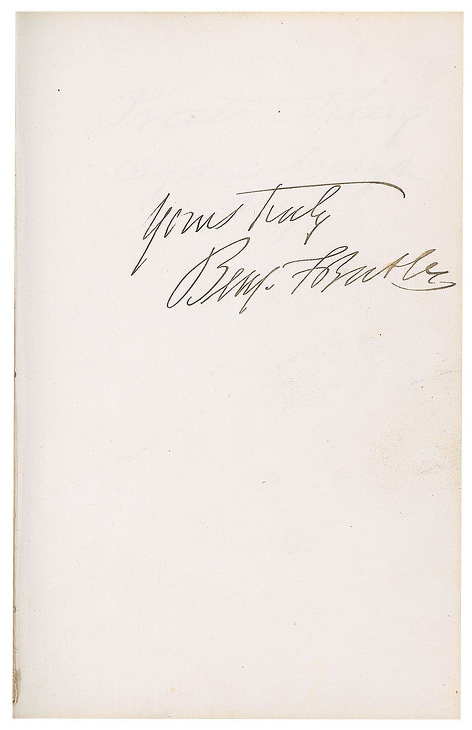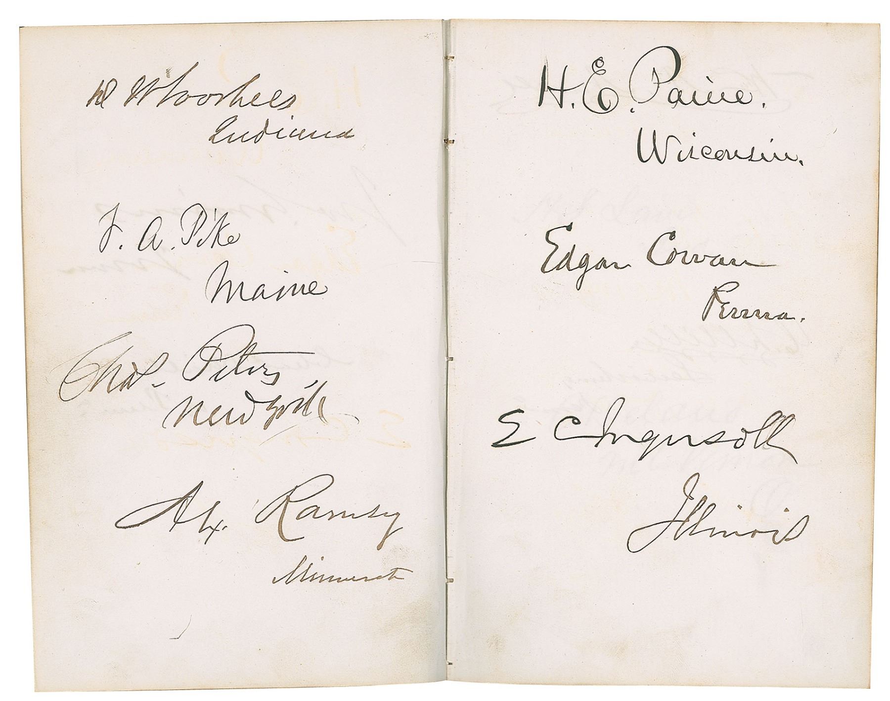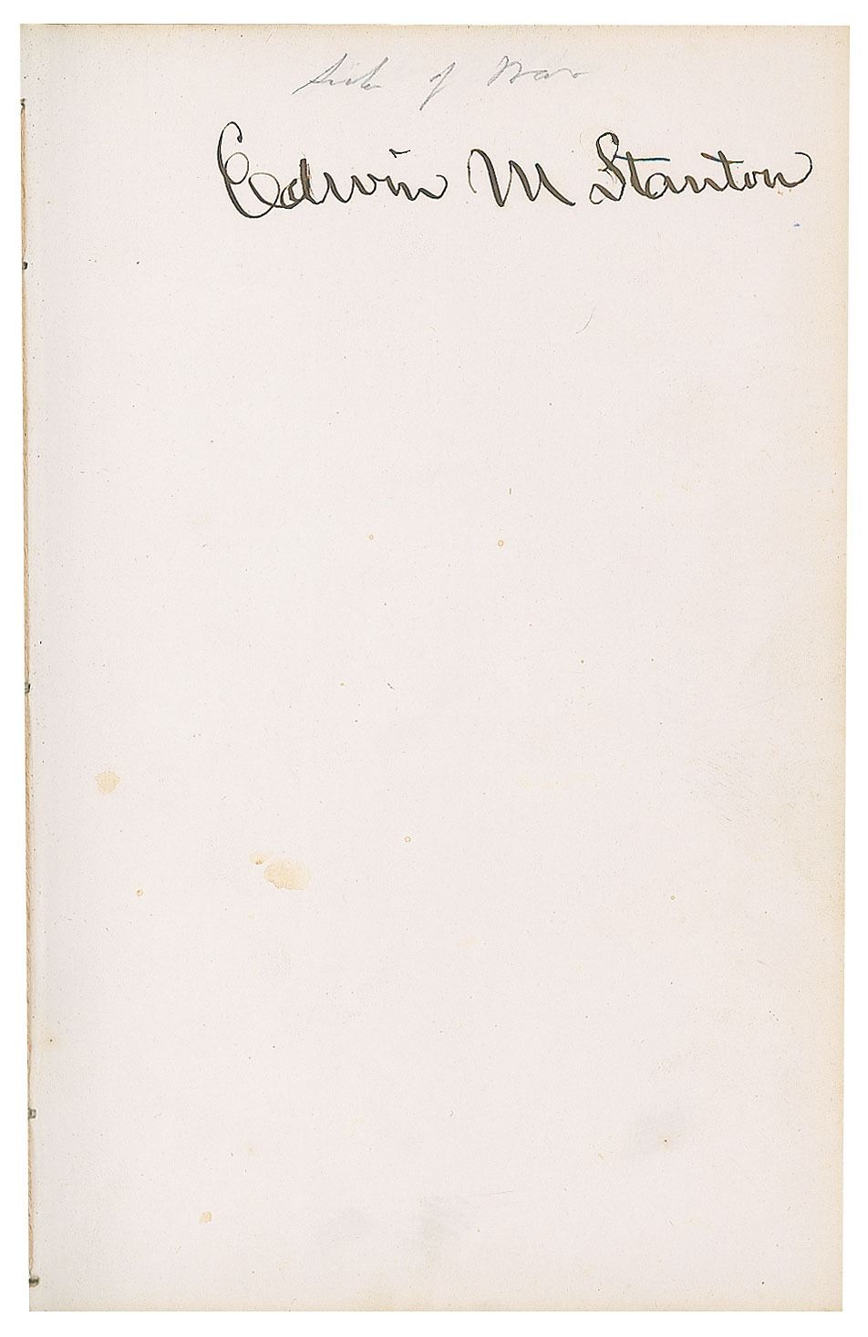 Signers include: Secretary of the Treasury Hugh McCulloch, who served from 1865 to 1869 and again from 1884 to 1885; Secretary of War Edwin M. Stanton, who served from 1862 to 1867 and again for five months in 1868; former Secretary of the Treasury William P. Fessenden, who served in that role from 1864 to 1865; and former Secretary of War Simon Cameron, who held that position from 1861 to 1862. Both Fessenden and Cameron were U.S. Senators in 1867 and 1868. Other prominent politicians who signed the album include Benjamin F. Butler of Massachusetts, Ira Harris of New York, Thaddeus Stevens of Pennsylvania, Lyman Trumbull of Illinois, Robert C. Schenck of Ohio, Nathaniel P. Banks of Massachusetts, Zachariah Chandler of Michigan, James W. Grimes of Iowa, Henry S. Lane of Indiana, William Sprague of Rhode Island, and Henry Wilson of Massachusetts. Butler, Schenck, and Banks were all Civil War generals before serving in Congress. In very good to fine condition, with scattered staining and a short edge tear to the speech draft, and cover wear to the album.
