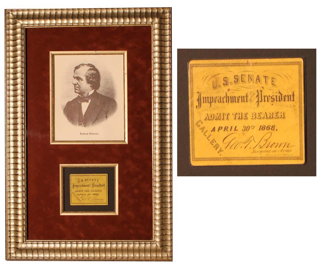 Andrew Johnson impeachment ticket from one day of the 5 March 1868 - 16 May 1868 trial, dated 30 April 1868. Ticket reads, ''U.S. Senate / Impeachment of the President / Admit the Bearer / April 30th 1868 / Gallery'' with a copy of Sergeant of Arms George Brown's signature at the bottom. Ticket, measuring 3.5'' x 3'', has a slight crease running through the middle, otherwise near fine condition. Silver frame with maroon suede-textured mat measures 15.75'' x 23.75''. Includes portrait of Johnson.