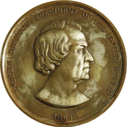 <B>Andrew Johnson Indian Peace Medal Signed by Anthony Paquet,</B></I> 1865, silvered bronze, 76mm diameter x 7mm thickness, Julian IP-40. The obverse carries a bust of Johnson facing right; the reverse depicts Columbia and an Indian chief clasping hands before a peace altar supporting a bust of George Washington. High relief and quite substantial. Most of the silvering is worn off, however the medal is un-pierced and free of damage. Very fine condition.<BR><BR><b>Shipping:</b> Miscellaneous Collectibles, Smal (<a target="_blank" href="http://www.heritageauctions.com/common/shipping.php">view shipping information</a>)