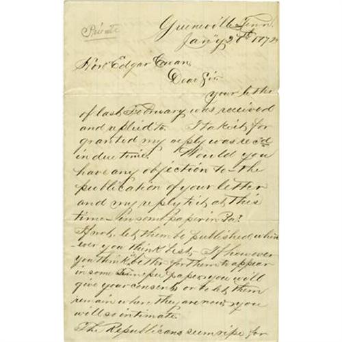 <B>Andrew Johnson Letter Signed</B></I> “<I>Andrew Johnson</B></I>”. Two pages, 5” x 7.75”, Greenville, Tennessee, January 27, 1872, to Edgar Cowan. In this letter to the former Senator from Pennsylvania, Andrew Johnson asks permission to publish a letter from Cowan in a local Pennsylvania newspaper. He writes in part: “<I>Would you have any objection to the publication of your letter and my reply to it at this time…The Republicans seem ripe for one presidential term…I would be pleased to hear from you on the posture of our public affairs at present.</B></I>” With the usual fold creases, some soiling on the creases, else very good condition. <I>From the collection of Henry E. Luhrs.</B></I><BR><BR><b>Shipping:</b> Flat Material, Small (<a target="_blank" href="http://www.heritageauctions.com/common/shipping.php">view shipping information</a>)