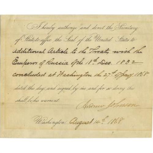 <B>Andrew Johnson Partly-Printed Document Signed</B></I> "<I>Andrew Johnson</B></I>". One page, 7.5" x 6.25", Washington, August 14th, 1868 in which Johnson orders the Secretary of State to affix the seal of the Untied States to the "<I>additional article to the treaty with the Emperor of Russia on the 18th Dec. 1832 concluded at Washington the 27th of January 1868...</B></I>" This amendment to the 1832 commercial treaty was concluded the same day that Andrew Johnson signed the documents officially recognizing the official transfer of territory between Russia and the United States. This was done in the presence of the Russian envoy on January 28 after the President received word that the formal transfer ceremony, held at Sitka on January 24, 1868, had concluded. This additional article to the 1832 treaty governed counterfeit goods and trademarks and provided reciprocal protection for manufacturers in both countries. Little could be really concluded between the two nations until the summer of 1868 when the House, in spite of the Senate's ratification of the Alaska treaty nearly a year before, finally voted the funds to pay for the new territory. This is likely why Johnson did not order Seward to affix the seal to this treaty until August, 1868. Trimmed, with faint evidence of mat burn, otherwise very good. A wonderful document with history from the addition of territory that became the forty-ninth state! <I>Ex. Henry E. Luhrs Collection.</B></I><BR><BR><b>Shipping:</b> Flat Material, Small (<a target="_blank" href="http://www.heritageauctions.com/common/shipping.php">view shipping information</a>)