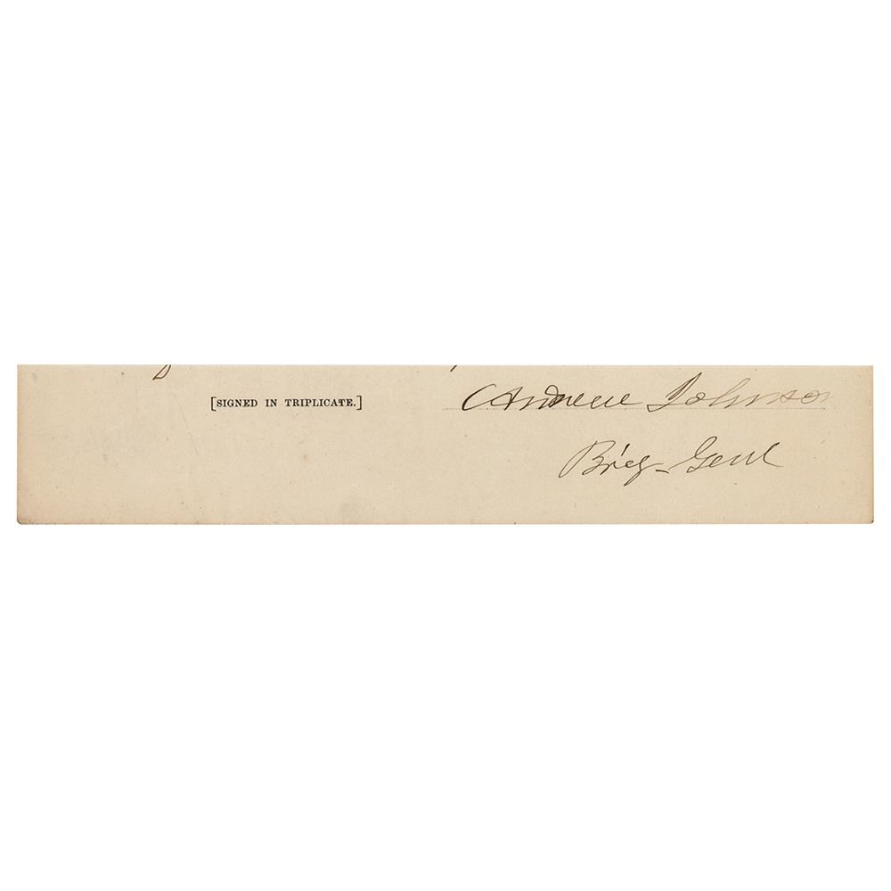 Ink signature, "Andrew Johnson, Brig. Genl,†on an off-white 8 x 1.5 sheet clipped from the close of a document. In fine condition, with light creasing to the left side. Johnson's first tenure in the Senate came to a conclusion in March 1862 when Lincoln appointed him military governor of Tennessee. The Senate quickly confirmed Johnson's nomination along with the rank of brigadier general.