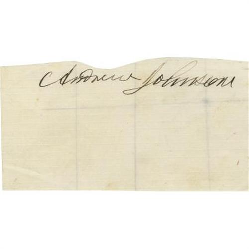 <B>President Andrew Johnson Signature</B></I> likely cut from a letter, on a small slip, 3.5" x 1.75"; tightly trimmed at top. Otherwise very good; accompanied by a stamp commemorating Johnson hinged to an album page with a brief hand-printed biography.<BR><BR><b>Shipping:</b> Flat Material, Small (<a target="_blank" href="http://www.heritageauctions.com/common/shipping.php">view shipping information</a>\)