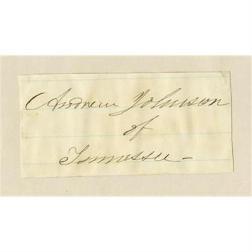 <B>Andrew Johnson Signature.</B></I> He has added "of Tennessee" beneath his name on this 3.5" x 1.75" sheet of lined paper. Johnson became our 17th president upon the death of Abraham Lincoln. He was a senator from Tennessee at the time of the secession and was the only southern senator not to resign his post. Light traces from mounting to a larger sheet, else fine. <I>From the collection of Henry E. Luhrs.</B></I><BR><BR><b>Shipping:</b> Flat Material, Small (<a target="_blank" href="http://www.heritageauctions.com/common/shipping.php">view shipping information</a>)