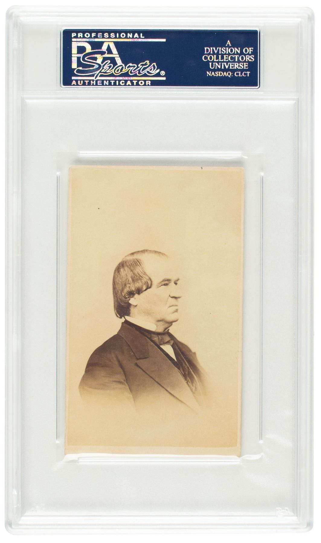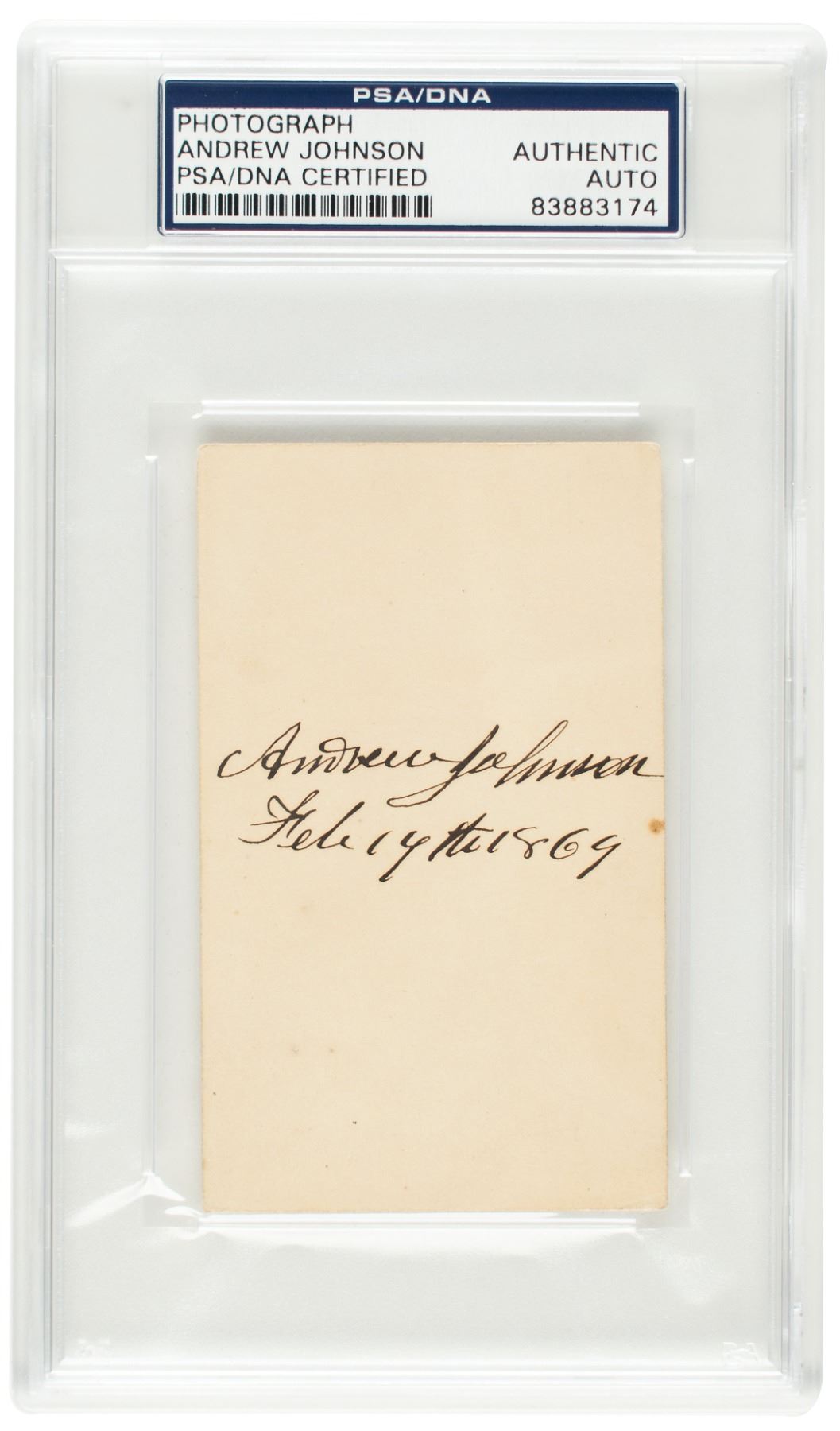 Sought-after 2.5 x 4 carte-de-visite portrait of Johnson in near profile, signed on the reverse in black ink as president, “Andrew Johnson, Feb. 14th 1869.” Encapsulated in a plastic PSA/DNA authentication holder. In fine condition. Signed photos of Johnson remain especially scarce, with this example augmented by its uncharacteristic right-facing pose.