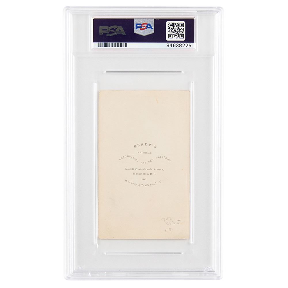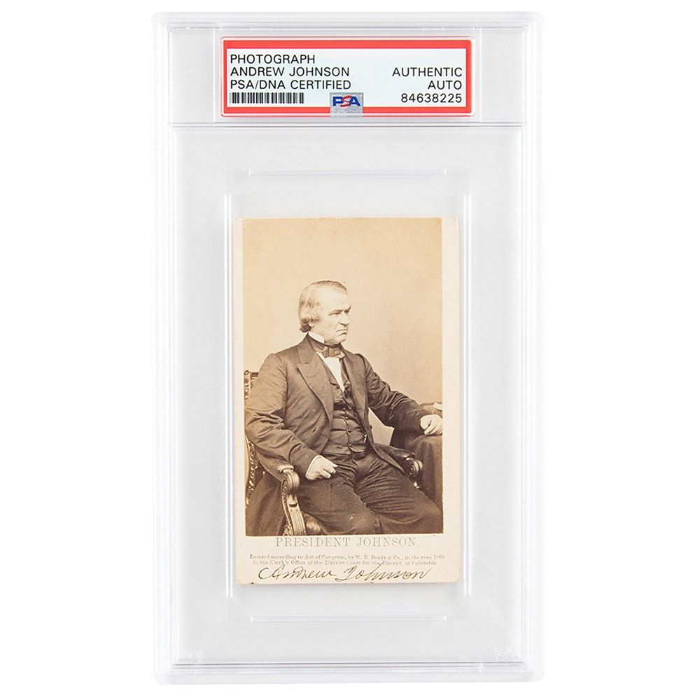 Rare 2.5 x 4 carte-de-visite photo of President Andrew Johnson in a seated pose, taken by Brady's National Photographic Portrait Galleries of Washington, crisply signed on the mount in ink. In fine condition, with lightly trimmed borders. Johnson's president-era signature is uncommon on its own—he frequently used a stamp due to a crippled right hand—and he is especially scarce in signed photos, this being one of a handful of cartes-de-visite we have offered. Encapsulated in a PSA/DNA authentication holder.