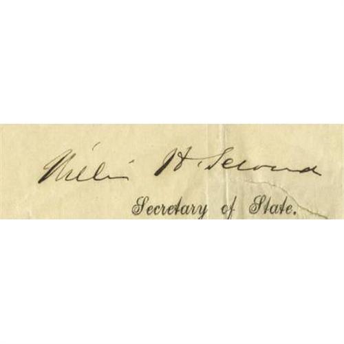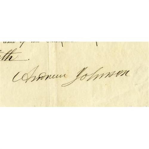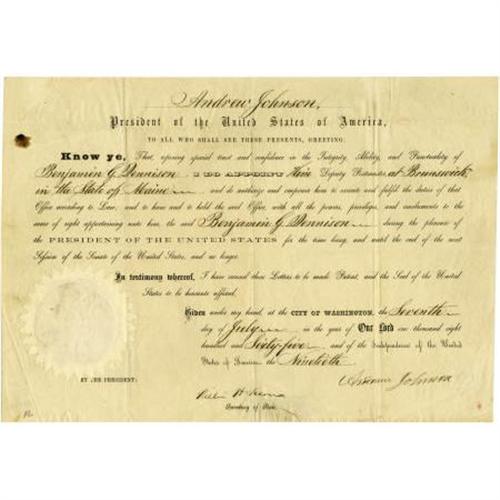 <B>Andrew Johnson Signed Postmaster's Appointment</B></I> DS "<I>Andrew Johnson</B></I>" as President and co-signed by "<I>William H. Seward</B></I> as Secretary of State, one page, 14" x 9.5", Washington, July 7, 1865, appointing Benjamin G. Dennison "<I>Deputy Postmaster at Brunswick, in the State of Maine</B></I>". With various folds and creasing, and a small one-inch tear along bottom margin; however the document remains in very good condition with an intact paper seal.<BR><BR><b>Shipping:</b> Flat Material, Small (<a target="_blank" href="http://www.heritageauctions.com/common/shipping.php">view shipping information</a>)