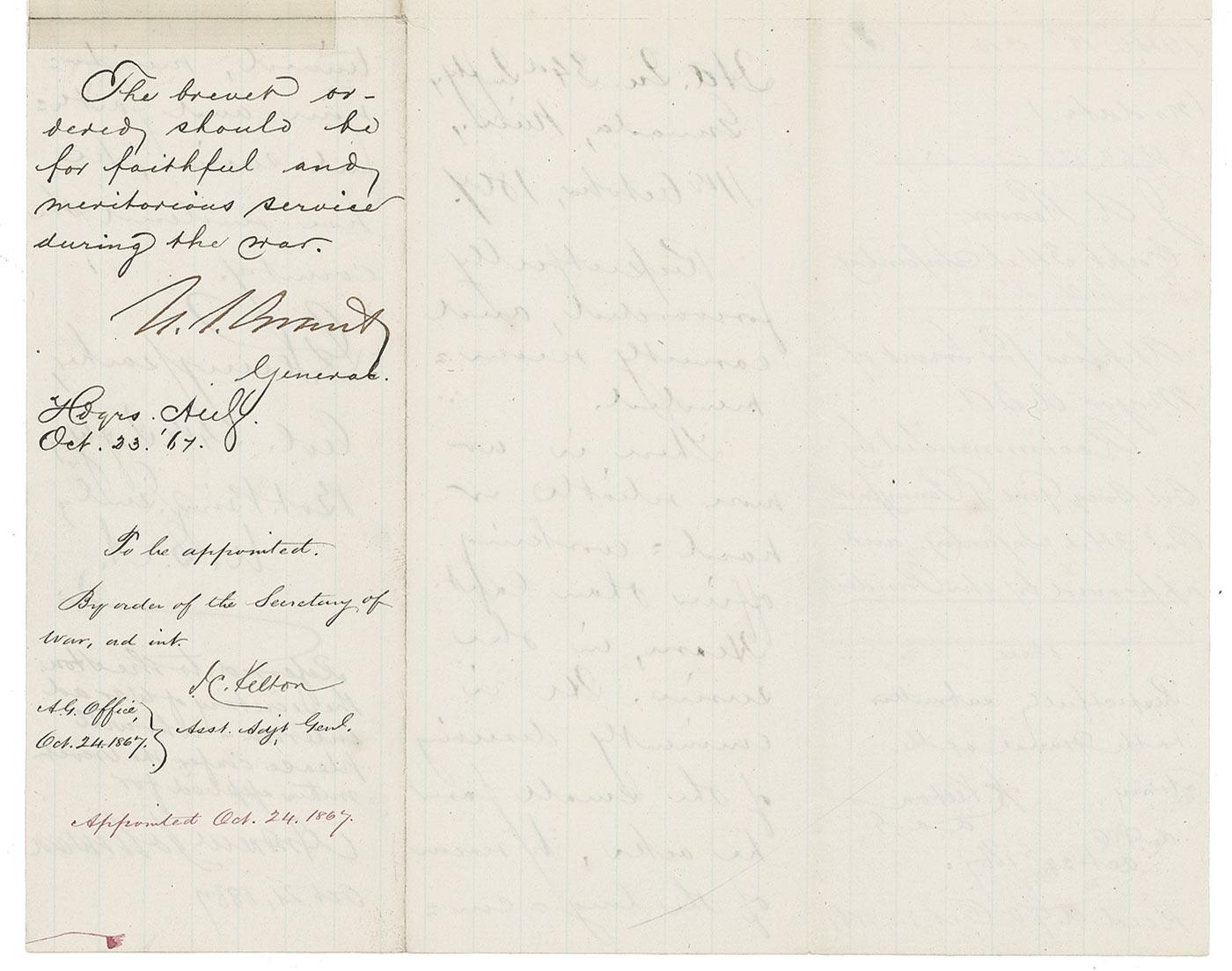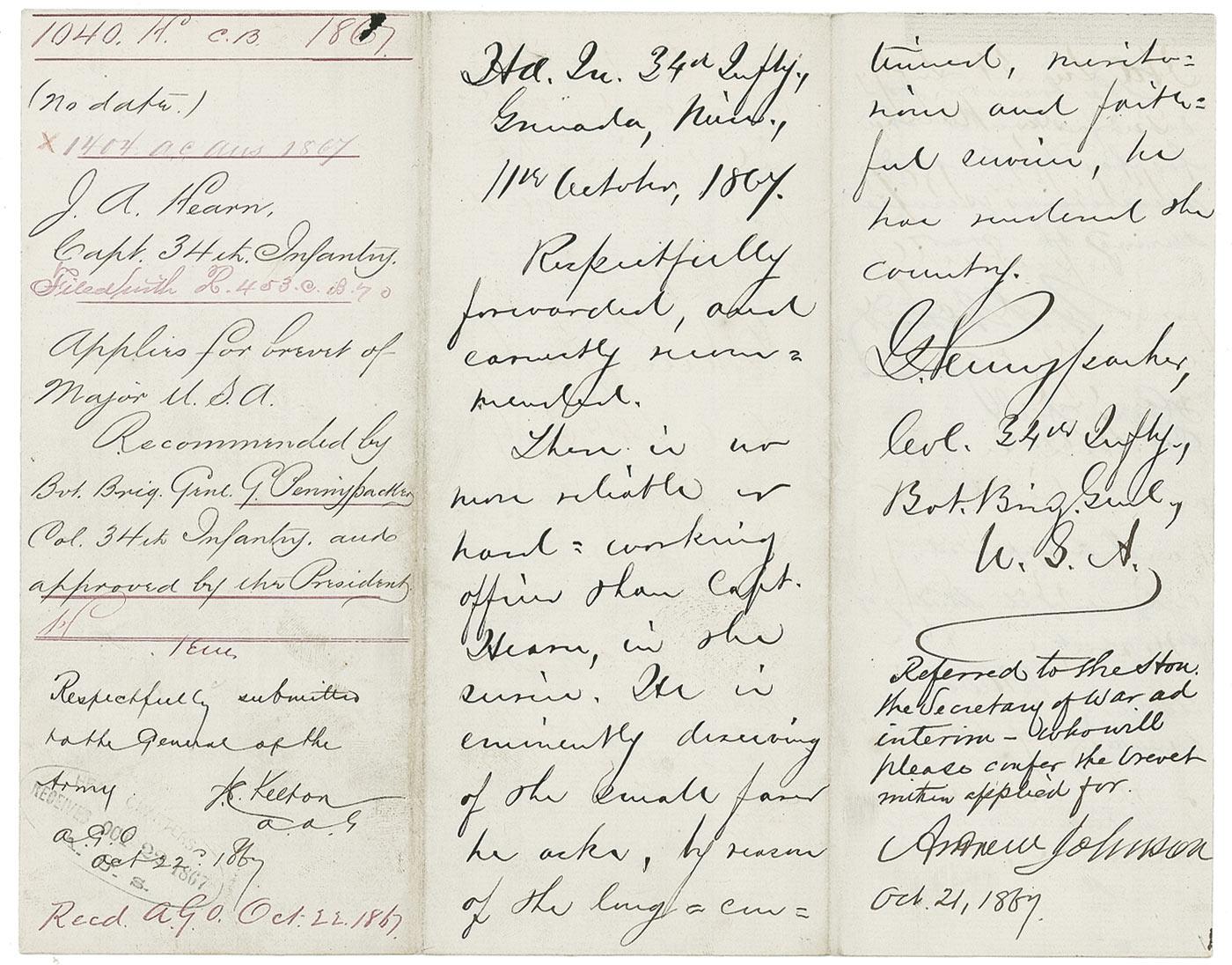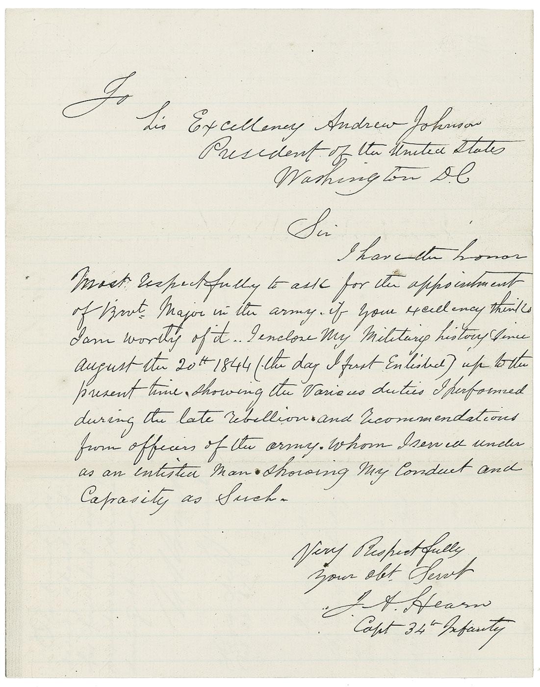 Handwritten endorsement, as president, “Referred to the Hon. Secretary of War ad interim—who will confer the brevet within applied for, Andrew Johnson, Oct. 21,1867,” and endorsement in another hand, dated October 23, 1867, reads “The brevet ordered should be for faithful and meritorious service during the war,” and signed by Grant, “U.S. Grant,” on the blank integral second page of an ALS written to Johnson by Captain Joseph A Hearn asking for a promotion. The letter on a 7.75 x 10 lightly-lined sheet reads, in part: “I have the honor…to ask for the appointment of Brvt. Major in the army if your excellency thinks I am worthy of it. I enclose my military history…up to the present time showing the various duties I performed during the late rebellion and recommendations from officers of the army whom I served under as an enlisted man showing my conduct and capacity as such.”