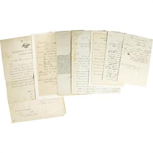 <B>Andrew Johnson's Administration.</B></I> A group lot of 18 autographs by members of President Johnson's administration in various formats. Includes: <B>Lafayette Sabine Foster</B></I> (signature); <B>John C. Howell</B></I> (AES, signed twice); <B>James Harlan</B></I> (ALS responding to a request for letter by Johnson); <B>Benjamin F. Wade</B></I> (signature); <B>John P. Usher</B></I> (signature); <B>Major L. Thomas</B></I> (ALS); <B>Henry Stanbery</B></I> (ALS); <B>John M. Schofield</B></I> (ALS); <B>Alexander W. Randall</B></I> (signature); <B>W.T. Otto</B></I> (clipped signature); <B>Hugh McCulloch</B></I> (signature); <B>T.W. Ferry</B></I> (LS); <B>Thomas Ewing</B></I> (ALS); <B>William M. Evarts</B></I> (signature); <B>William Dennison</B></I> (signature); <B>Orville H. Browning</B></I> (signature); and <B>James Harlan</B></I> (DS and signature). Overall condition is good to very good, should be reviewed for content. <I>From the collection of Henry E. Luhrs.</B></I><BR><BR><b>Shipping:</b> Miscellaneous Collectibles, Smal (<a target="_blank" href="http://www.heritageauctions.com/common/shipping.php">view shipping information</a>)
