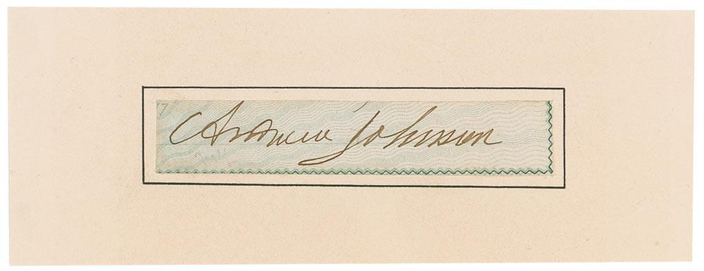 Ink signature, “Andrew Johnson,” on a green and white 3 x .5 slip, clipped from a document or check, and affixed to a 5 x 2 off-white slip. In fine condition, with a bit of scattered light toning.