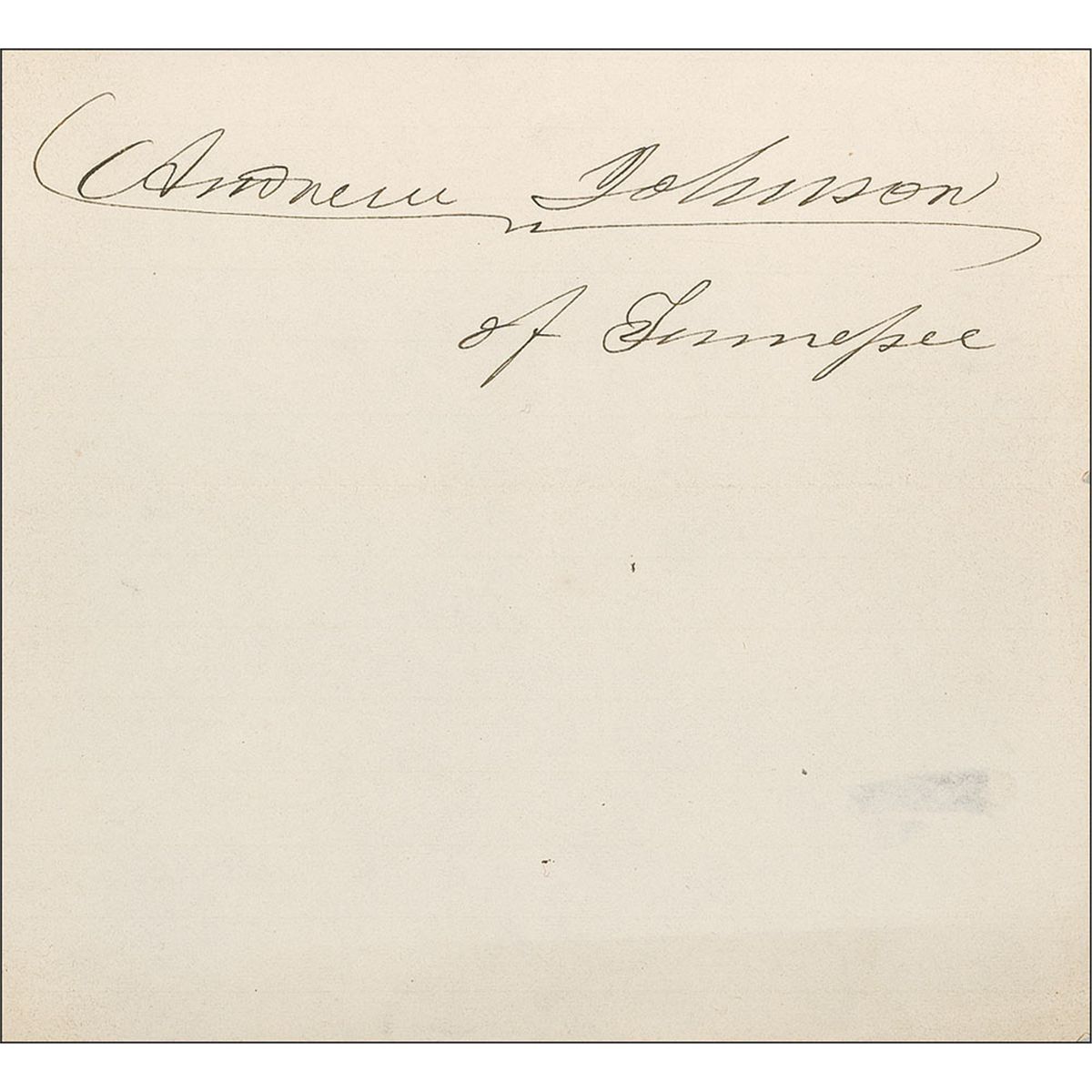 Stately ink signature, “Andrew Johnson, of Tennesee,” on an off-white 5 x 4.5 sheet. In fine condition, with light surface creasing and a central horizontal fold, none of which affect the majestic signature.