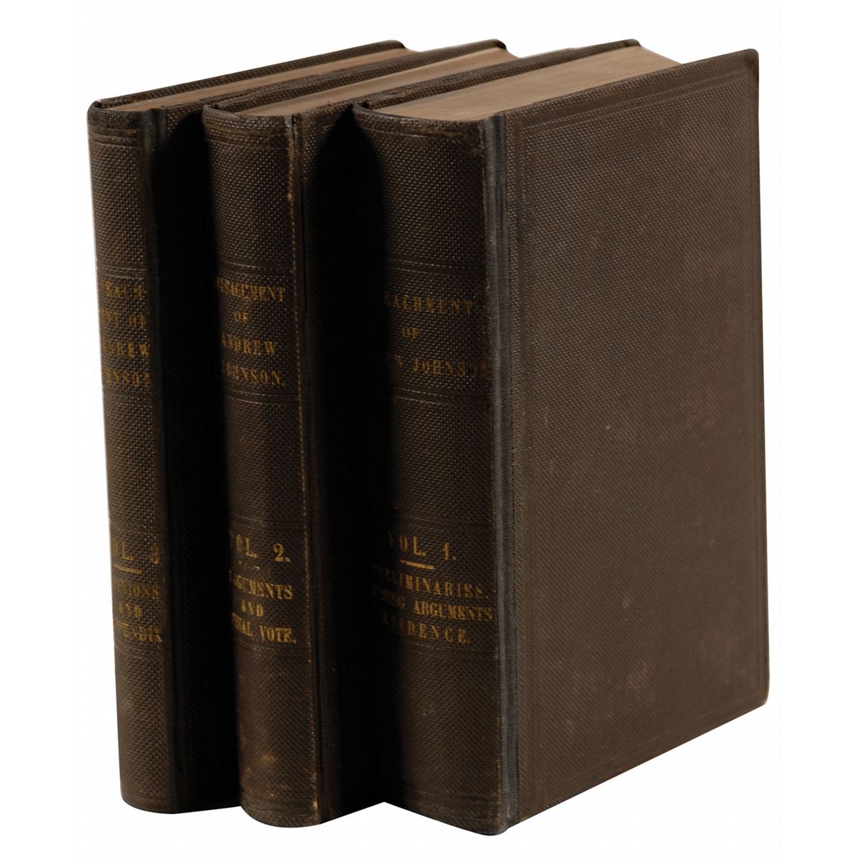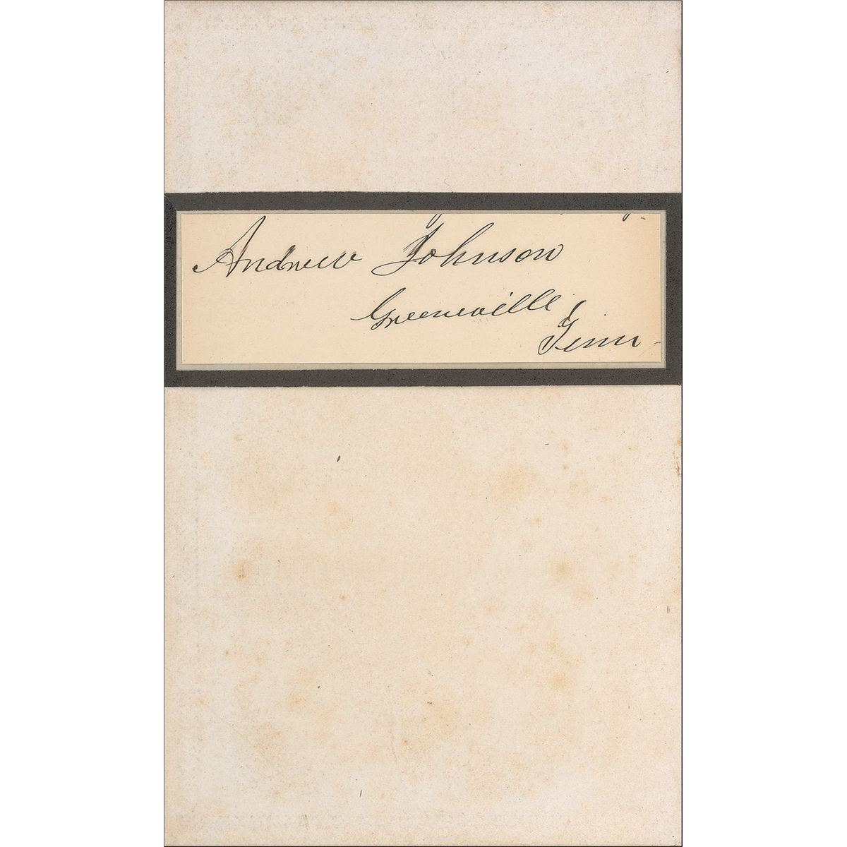 Ink signature, “Andrew Johnson, Greenville, Tenn,” on an off-white 5 x 1.5 clipped slip affixed to the front pastedown of an 1868 hardcover edition of Volume I of Trial of Andrew Johnson, President of the United States, Before the Senate of the United States, on Impeachment by the House of Representatives for High Crimes and Misdemeanors, with all three volumes present. Signature rates fine condition, with books rating overall good to very good, with reinforced spines.