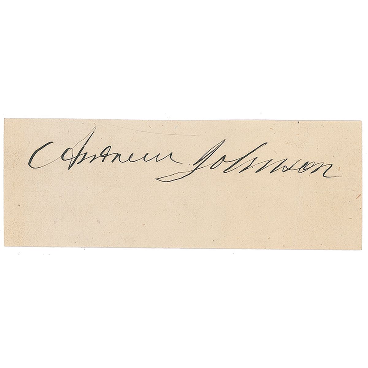 Stately ink signature, “Andrew Johnson,” on an off-white 4 x 1.5 clipped slip. In fine condition, with light toning. Accompanied by a signature of his vice president, Schuyler Colfax.