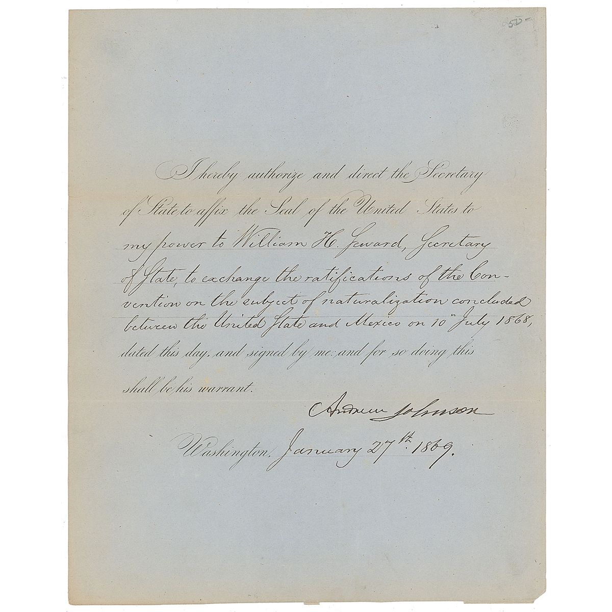 Partly-printed DS as president, one page, 8 x 10, January 27, 1869. President Johnson orders the Secretary of State “to affix the Seal of the United States to my power to William H. Seward, Secretary of State, to exchange the ratifications of the Convention on the subject of naturalization concluded between the United States and Mexico on 10th July 1868.” In very good to fine condition, with scattered creases, horizontal fold passing through the tops of a couple letters of signature, scattered light toning, mainly to folds and edges, and a small pencil notation to top right.