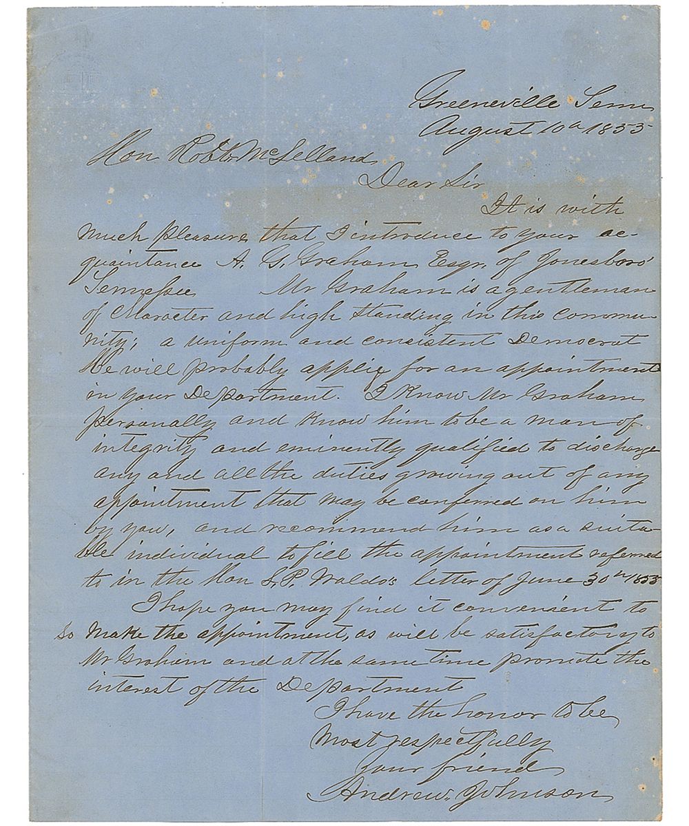 Early ALS, one page, 7.75 x 10, August 10, 1853. Letter of introduction to Robert McClellan. In part: “It is with much pleasure that I introduce to your acquaintance A. G. Graham, Esq. of Jonesboro, Tennessee…a gentleman of character and high standing in this community; a uniform and consistent Democrat. He will probably apply for an appointment in your Department. I know Mr. Graham personally and know him to be a man of integrity and eminently qualified to discharge any and all the duties growing out of any appointment.” In very good to fine condition, with intersecting folds, one through a single letter of signature, scattered white spotting, and toning to upper portion. Accompanied by an unsigned engraving.