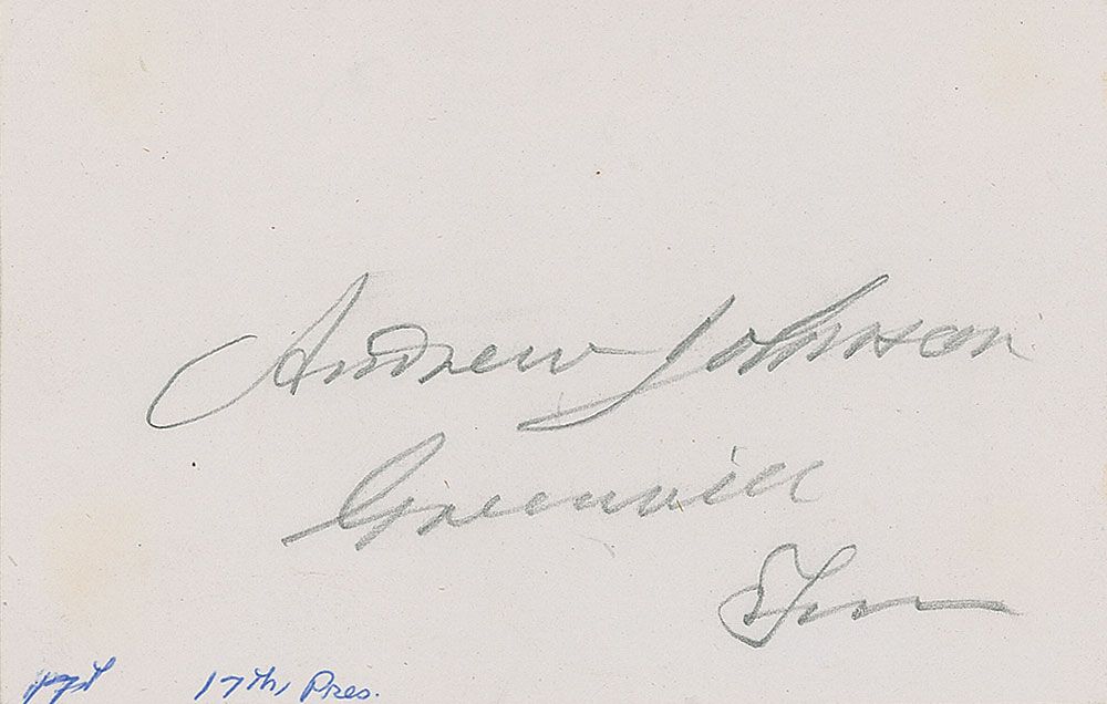 Uncommon pencil signature, “Andrew Johnson, Greenville, Tenn,” on an off-white 4.25 x 2.75 card. In fine condition, with a bend passing through the first couple letters.