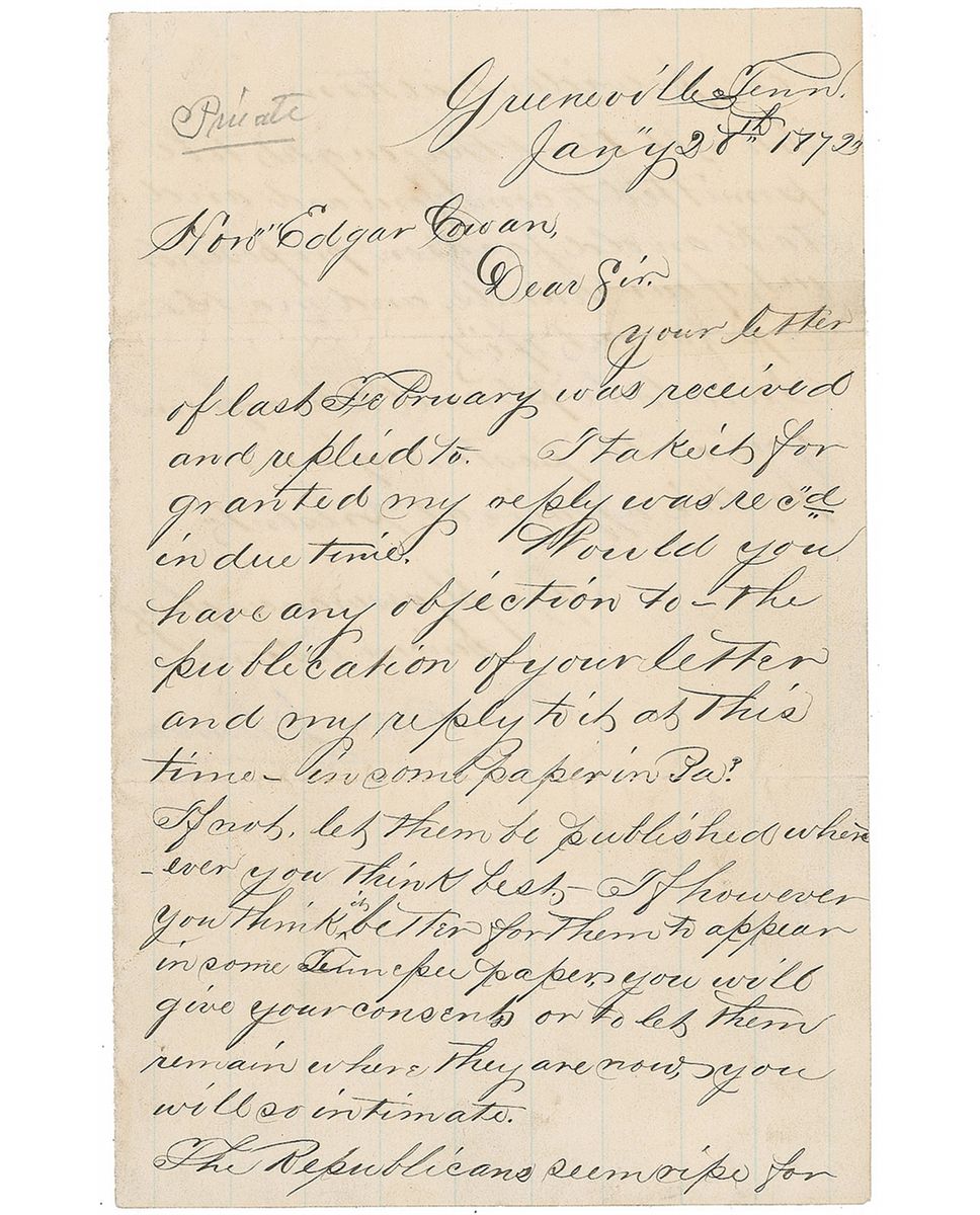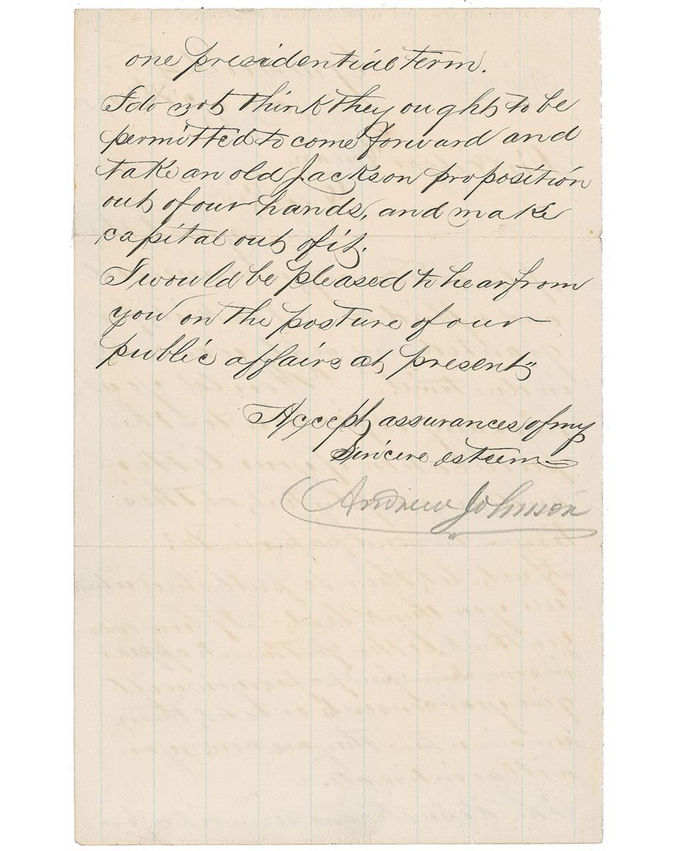 LS, signed in pencil, one page both sides, 4.75 x 7.75, January 27, 1872. Letter to Senator Edgar Cowan, marked “Private,” at the top. In part: “Would you have any objection to the publication of your letter and my reply to it at this time in some paper in Pennsylvania? If not, let them be published wherever you think best. If, however, you think it better for them to appear in some Tennessee papers, you will give your consent, or to let them remain where they are, you will so intimate. The Republicans seem ripe for one presidential term. I do not think they ought to be permitted to come forward and take an old Jackson proposition out of our hands and make capital out of it. I would be pleased to hear from you on the posture of our public affairs at present.” In fine condition, with small tape repair to one edge of a horizontal fold. During his administration, Johnson sent Congress proposals for amendments to limit the president to a single six-year, to and make the president and the Senate directly elected, and to institute term limits for judges.