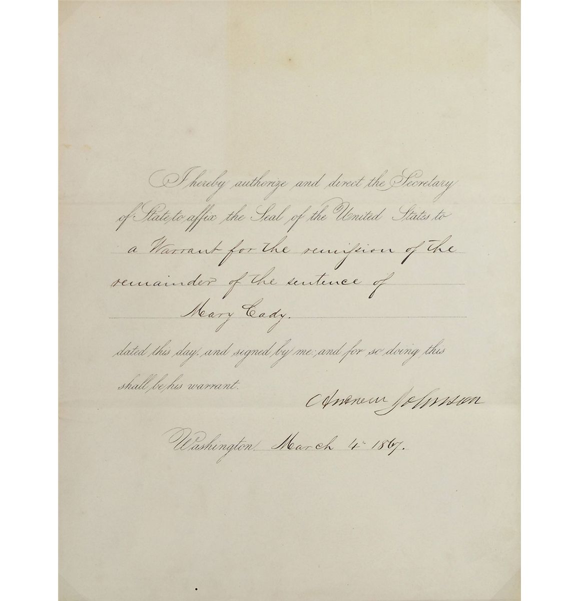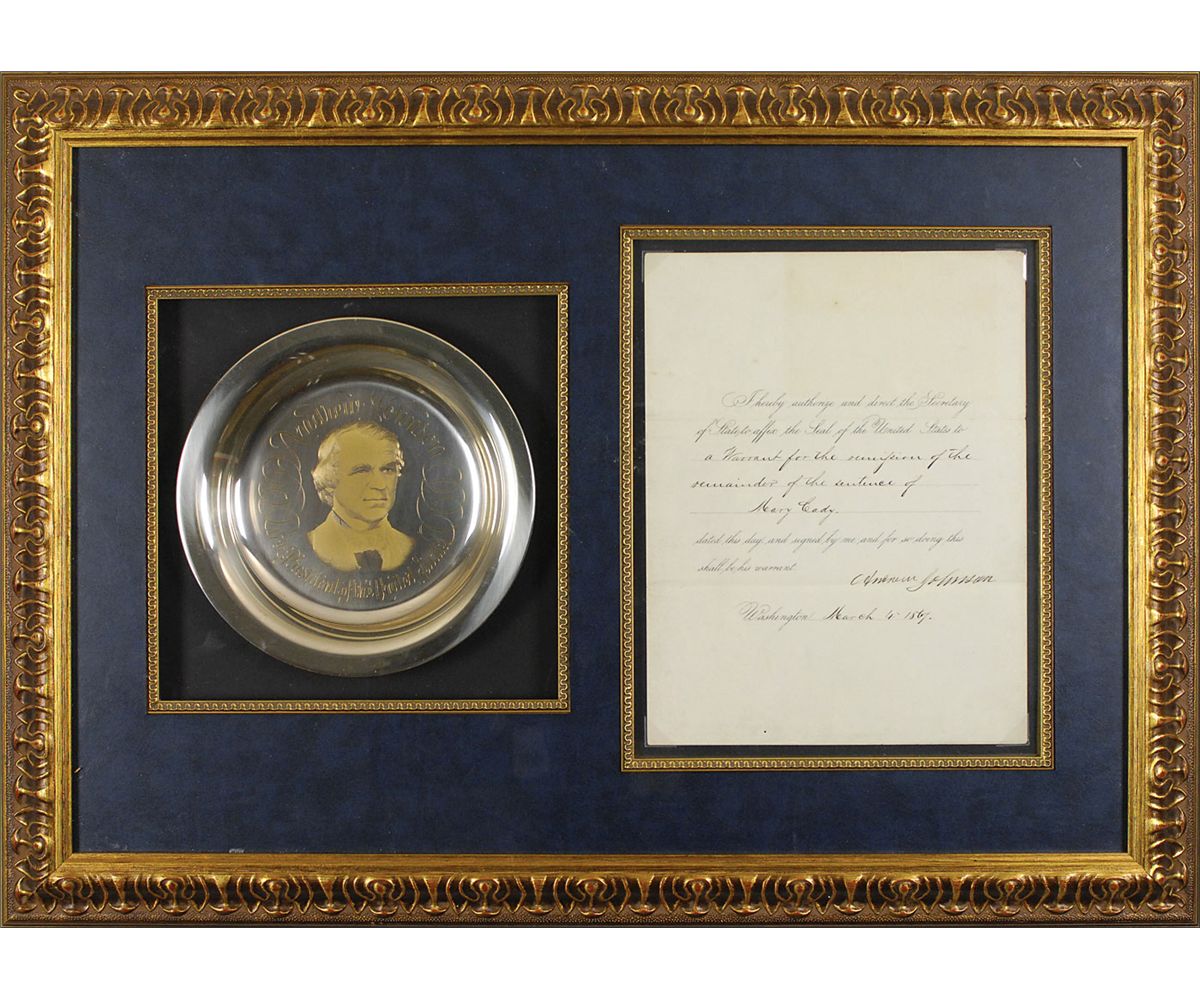 Partly-printed DS as president, one page, 8.5 x 11, March 4, 1867. An authorization for the secretary of state to affix the Seal of the United States to “a warrant for the remission of the remainder of the sentence of Mary Cady.” Suede-matted and framed with a gold-inlaid, sterling silver portrait plate issued in a limited edition by the Franklin Mint in the early-to-mid 1970s, to an overall size of 27 x 19.5. Intersecting folds, a horizontal fold passing through portion of signature, and some scattered light toning, otherwise fine condition. Oversized.