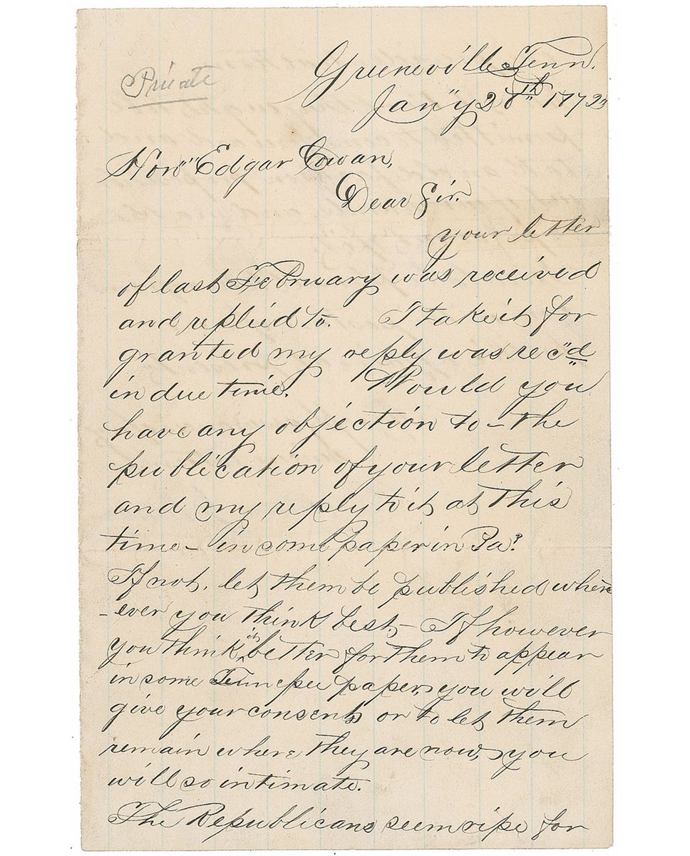 LS, signed in pencil, one page both sides, 4.75 x 7.75, January 27, 1872. Letter to Senator Edgar Cowan, marked “Private,” at the top. In part: “Would you have any objection to the publication of your letter and my reply to it at this time in some paper in Pennsylvania? If not, let them be published wherever you think best. If, however, you think it better for them to appear in some Tennessee papers, you will give your consent, or to let them remain where they are, you will so intimate. The Republicans seem ripe for one presidential term. I do not think they ought to be permitted to come forward and take an old Jackson proposition out of our hands and make capital out of it. I would be pleased to hear from you on the posture of our public affairs at present.” In fine condition, with small tape repair to one edge of a horizontal fold. During his administration, Johnson sent Congress proposals for amendments to limit the president to a single six-year term, to make the president and the Senate directly elected, and to institute term limits for judges.