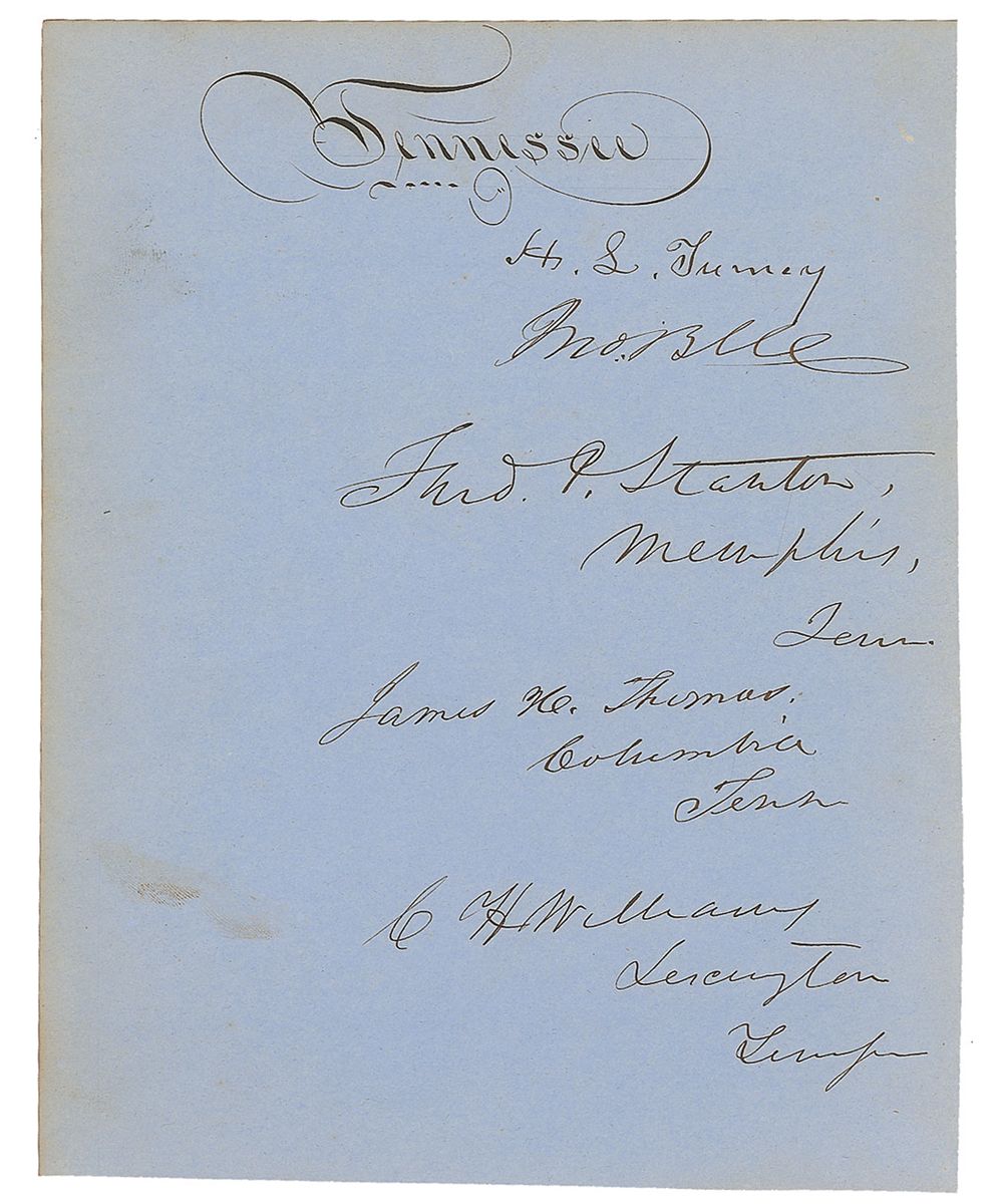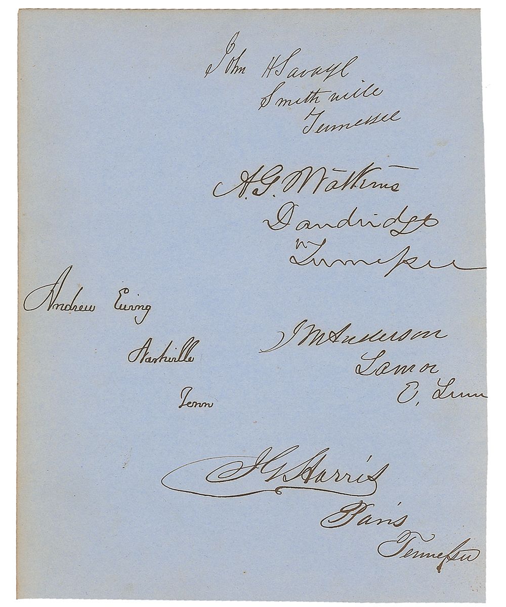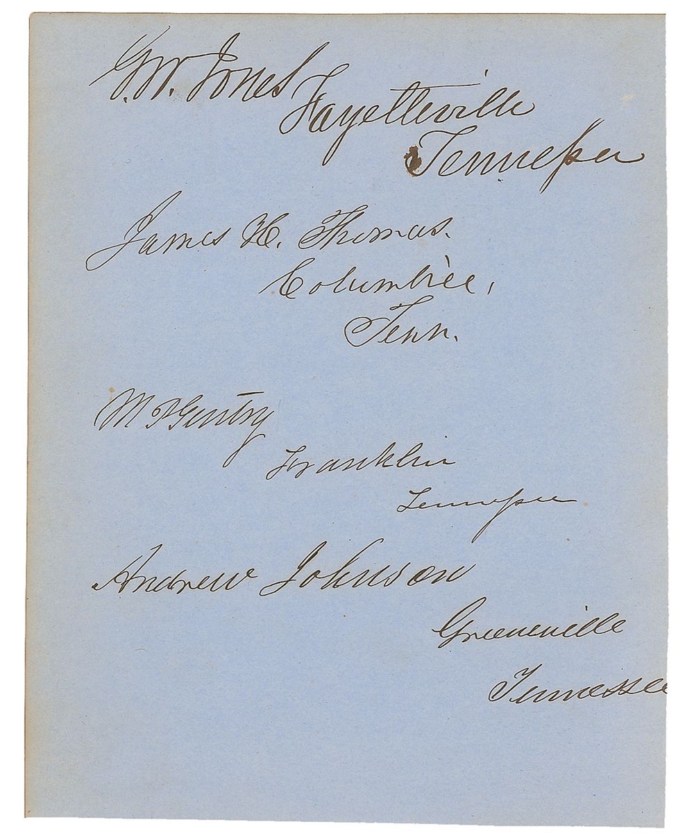 Ink signature, “Andrew Johnson, Greeneville, Tennessee,” on a light blue 5.5 x 8 album page. Also signed by fellow Tennessee congressmen James H. Thomas, Meredith P. Gentry, and George W. Jones; two sheets of the same size are signed by Hopkins L. Turney, John Bell, Frederick P. Stanton, James H. Thomas, Christopher H. Williams, John H. Savage, Albert G. Watkins, Josiah M. Anderson, Andrew Ewing, and Isham G. Harris. In fine condition.