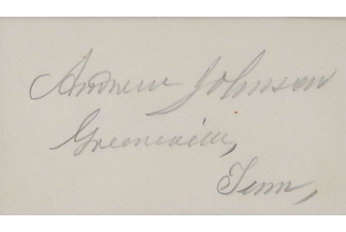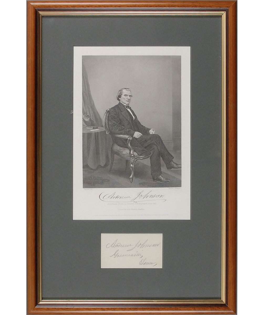 Bold pencil signature, “Andrew Johnson, Greenville, Tenn,” on an off-white slip. Matted and framed with an engraved portrait to an overall size of 12 x 18. In fine condition.