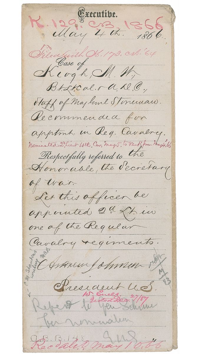 Ink endorsement signature, as president, “Andrew Johnson,” on an Executive envelope dated at the top, May 4, 1866. Endorsement relates to a cavalry appointment for M. W. Keogh, and reads, in part: “Recommended for apptmt. in Reg. Cavalry, respectfully referred to the Honorable, the Secretary of War. Let this officer be appointed 2nd Lt. in one of the Regular Cavalry regiments,” and signed underneath by Johnson. Envelope also bears a pencil endorsement from Edwin Stanton, signed “EMS.” In fine condition, with expected light soiling and handling wear.