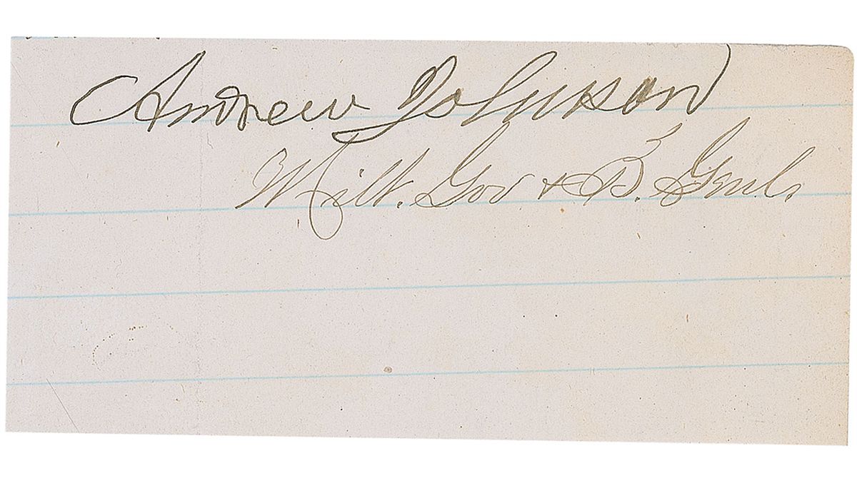 Ink signature, “Andrew Johnson,” on an off-white 3.75 x 1.75 lightly-lined slip, clipped from the closing of a letter, with “Milt. Go. & B. Genl,” added in another hand under his signature. In fine condition, with a vertical fold to left side passing through a single letter of signature.