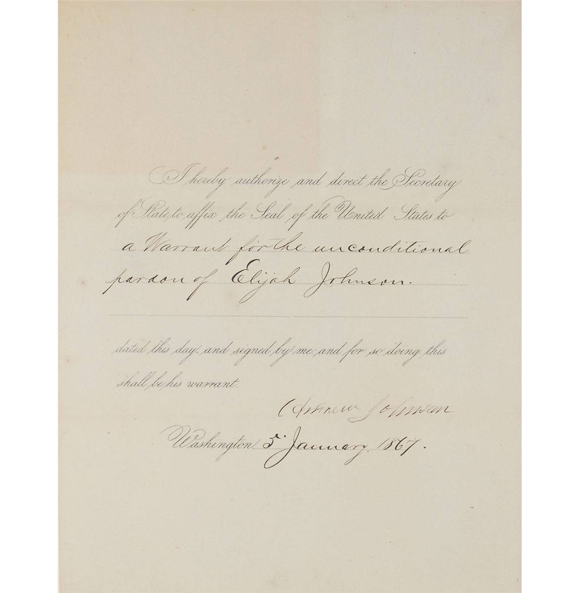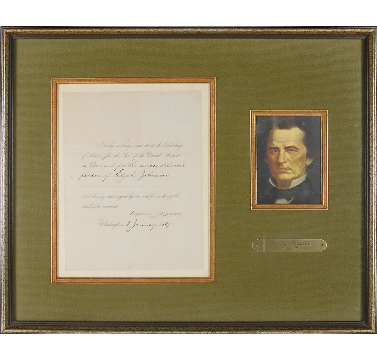 Partly-printed DS as president, one page, 8.25 x 10.75, January 5, 1867. President Johnson directs the secretary of state to “affix the Seal of the United States to a Warrant for the unconditional pardon of Elijah Johnson.” Signed at the conclusion by President Johnson. Mounted, cloth-matted and framed with a portrait and nameplate to an overall size of 23 x 19. A light horizontal fold passing through the signature, a block of mild toning to the upper left, and an unobtrusive repaired tear to the top edge.