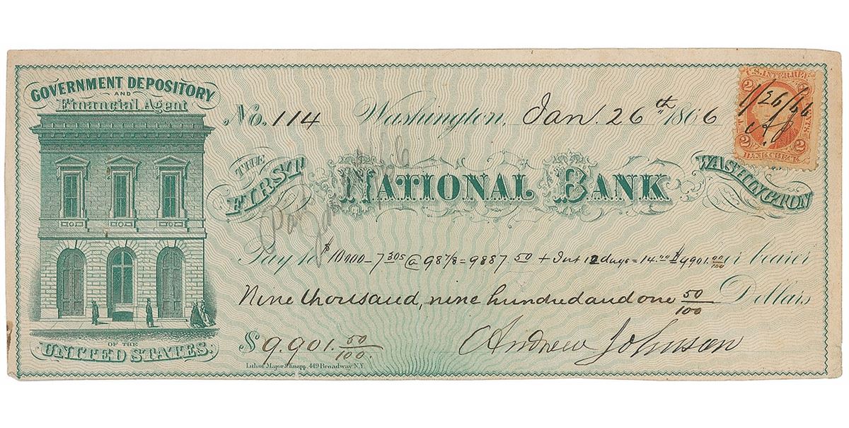 Rare Government Depository First National Bank check, 8.25 x 3.25, filled out in another hand and signed by Johnson as president, “Andrew Johnson,” made payable for $9,901.50, January 26, 1866. The ‘pay to’ line contains a lengthy bond calculation resulting in the total amount. Also bears an orange two-cent revenue stamp affixed to the upper right initialed by Johnson, “AJ.” In fine condition, with a few light vertical folds, a small tear to the lower left, expected cancellation cuts and bank notations, and slight soiling. A wonderfully attractive check featuring an ornate vignette of the bank building with, a sought-after Johnson signature as president.