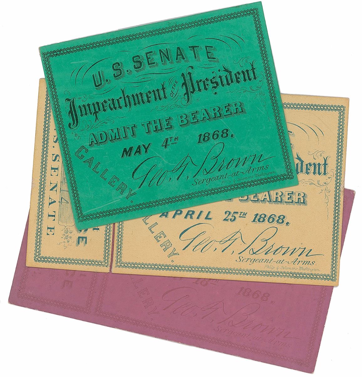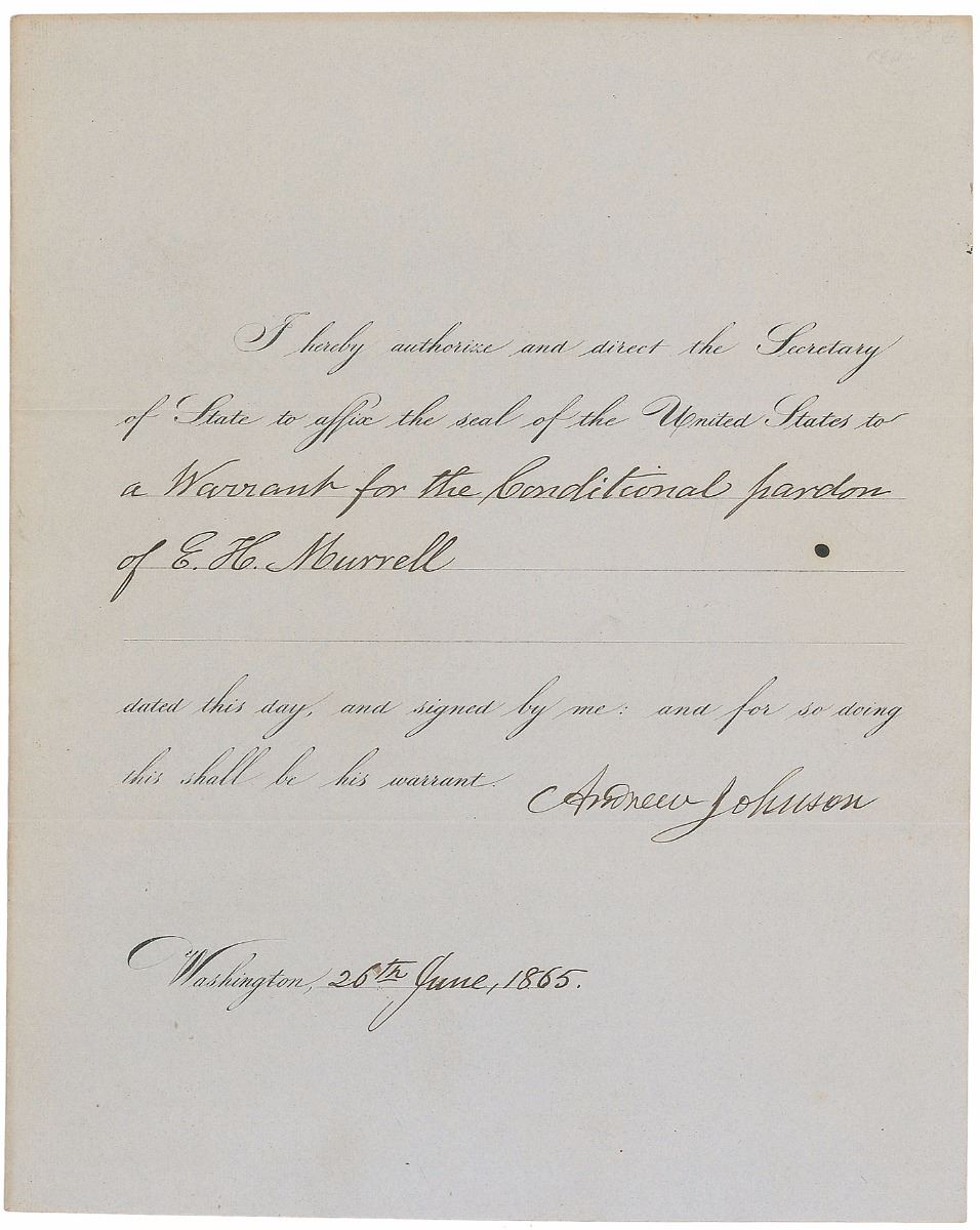 Partly-printed DS as president, one page, 8 x 10, June 26, 1865. President Johnson directs the “Secretary of States to affix the seal of the United State to a Warrant for the Conditional pardon of E. H. Murrell.” Crisply signed at the conclusion by President Johnson. In fine condition. Accompanied by three different tickets to the Senate Gallery for Johnson’s impeachment trial.