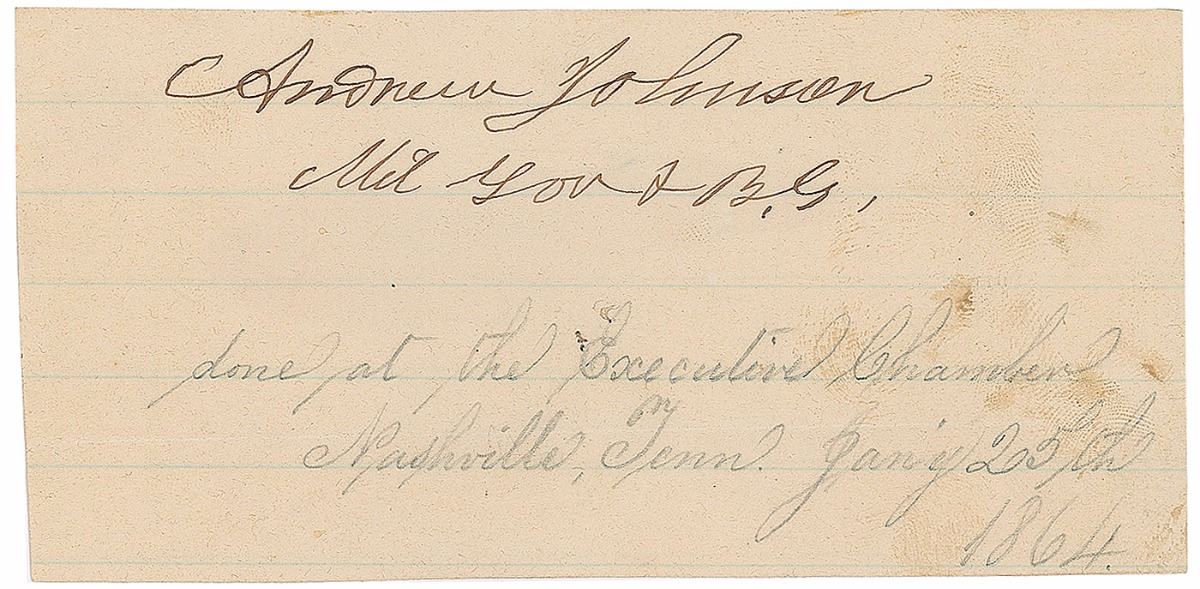 Civil War–dated ink signature, “Andrew Johnson, Mil. Gov. & B. G.,” on an off-white 5 x 2.5 slip bearing a collector’s pencil notation below, “Done at the Executive Chamber, Nashville, Tenn., Jan’y 25th, 1864.” In fine condition.