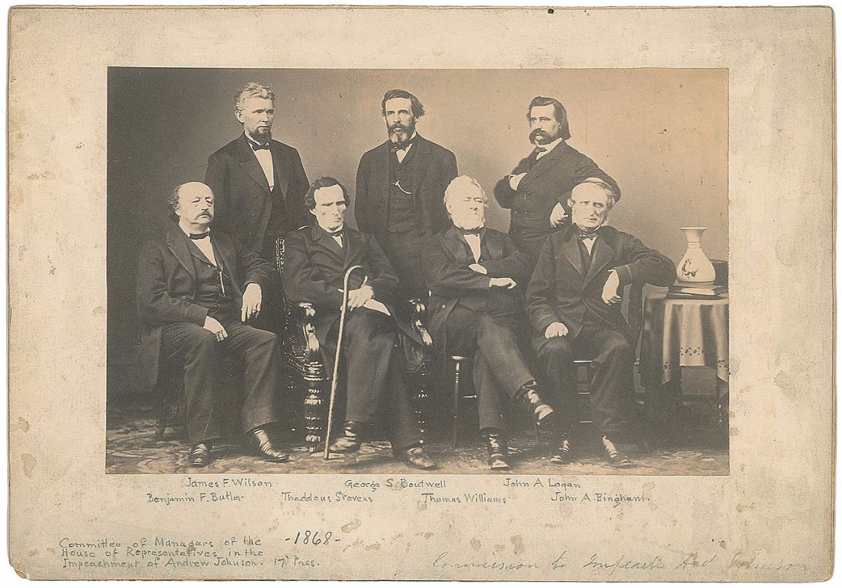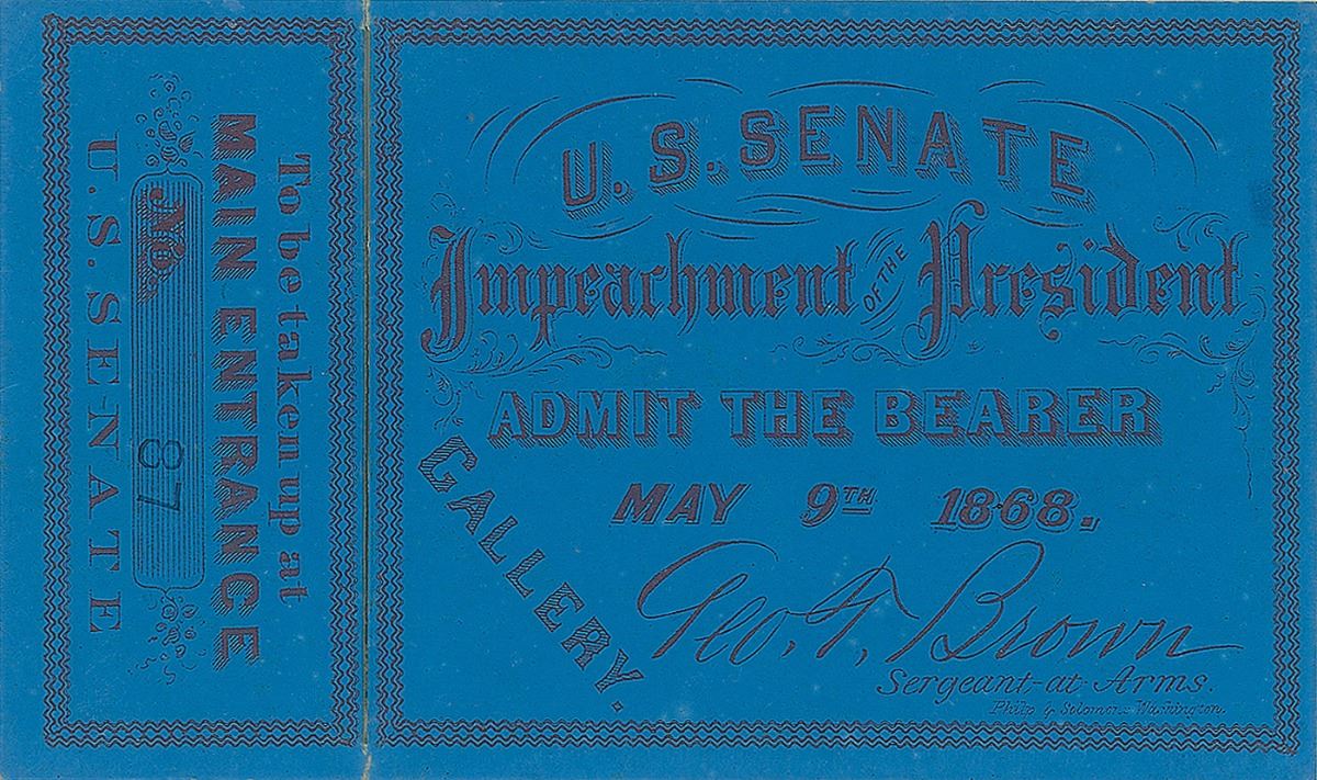 Two unsigned items related to the impeachment of Andrew Johnson: a blue ticket for admission to the gallery of the US Senate on May 9, 1868, with stub present but detached; and a 7.5 x 5 photo of the commission to impeach Johnson, consisting of Benjamin F. Butler, James F. Wilson, Thaddeus Stevens, George S. Boutwell, Thomas Williams, John A. Logan, and John A. Bingham, affixed to a 10 x 7 mount. Ticket is removably encapsulated in a mylar sleeve. In overall very good to fine condition, with scattered soiling and staining to the photo mount and pencil identifications in an unknown hand.