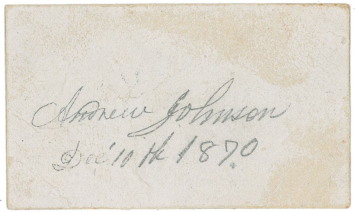 Pencil signature, “Andrew Johnson, Dec. 10th 1870,” on an off-white 3.25 x 2 card. In very good condition, with light stains and heavy creases.