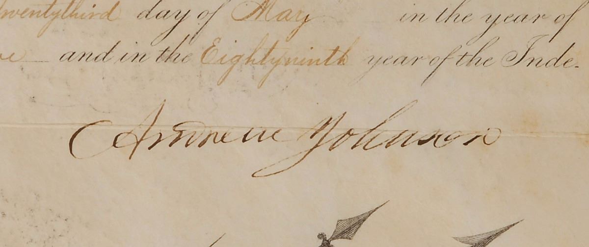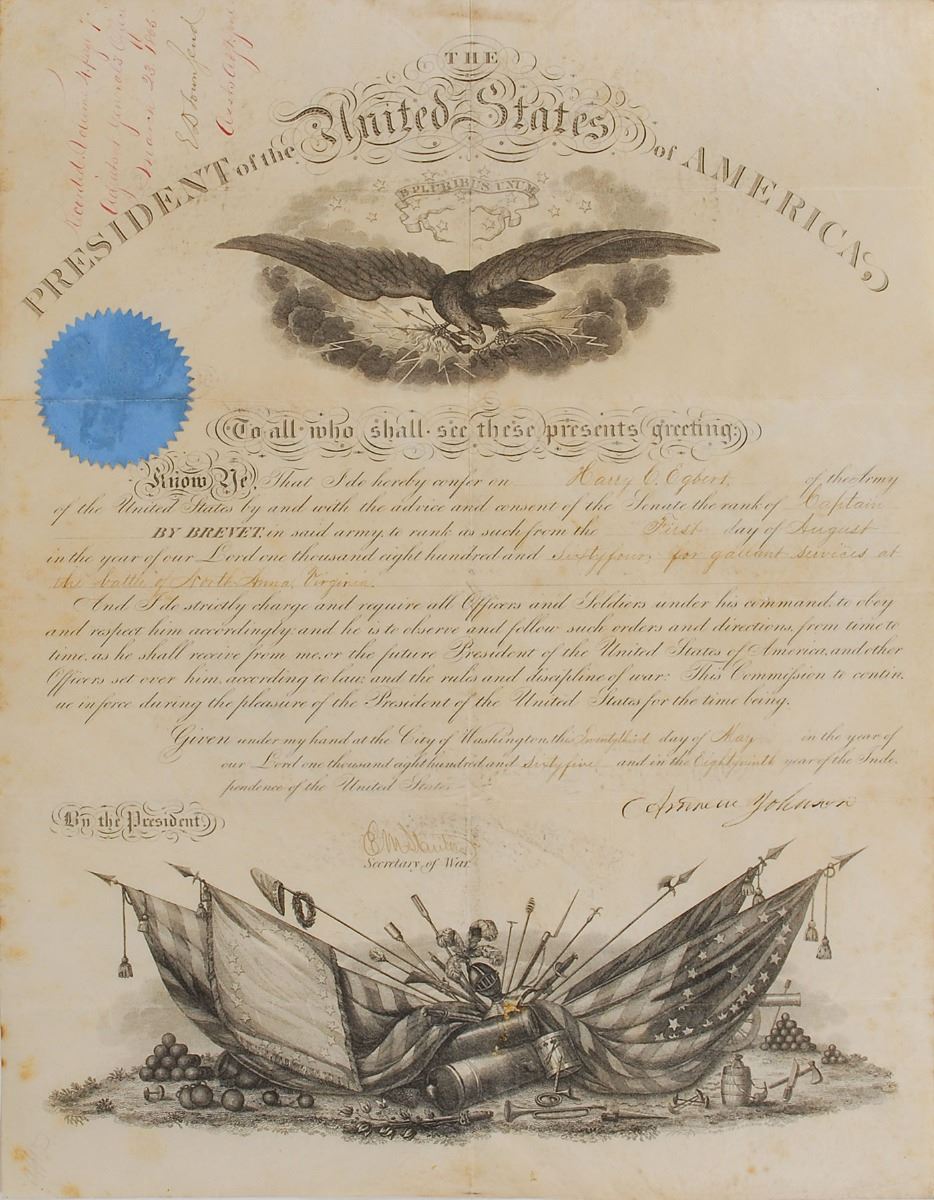 Partly-printed vellum DS as president, one page, 13.75 x 17.5, May 23, 1865. President Johnson confers Harry C. Egbert to “the rank of Captain by Brevet…for gallant services at the battle of North Anna, Virginia.” Signed at the conclusion by Johnson, and countersigned by Edwin M. Stanton as secretary of war. Blue paper seal affixed to upper left remains intact. In very good to fine condition, with scattered overall light tonight and scuffing.