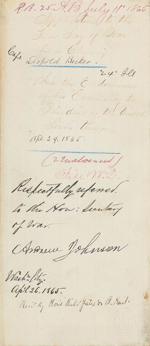 Scarce Civil War–dated early endorsement signature as president, “Andrew Johnson,” forwarding a letter to Secretary of War Edwin M. Stanton on April 26, 1865, on the reverse of a letter to Stanton from Leopold Becker, one page, 7.75 x 9.75, April 23, 1865. Becker’s letter, in full: “I have the pleasure to apply for a Clerkship in your Department, and enclose Testimonial herewith.” In fine condition, with expected document wear. Johnson had assumed the presidency only eleven days earlier upon the assassination of Abraham Lincoln.