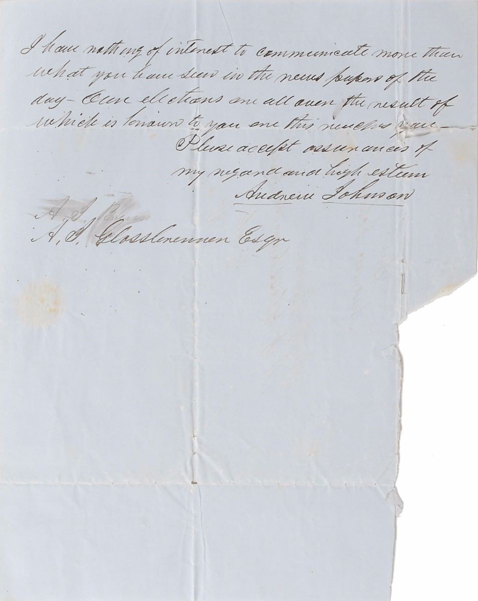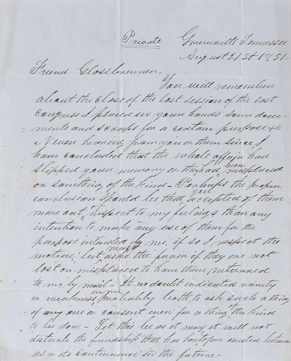 ALS, two pages on two adjoining sheets, 7.75 x 9.75, August 21, 1851. Written from Greeneville, Tennessee, a letter to A. J. Glossbrenner, the Sergeant at Arms of the United States House of Representatives, in part: “You will remember about the close of the last session of the last Congress I placed in your hands some documents and scraps for a certain purpose etc. Never hearing from you on them since, I have concluded that the whole affair has slipped your memory or they had been misplaced or something of the kind. Perhaps the proper conclusion should be that you accepted of them more out of respect to my feelings than any intention to make any use of them for the purpose intended by me, if so I respect the motive, but must ask the person if they are not lost or misplaced to have them returned to me by mail. It no doubt indicated vanity or weakness in me, probably both, to ask such a thing of any one or consent even for a thing of the kind to be done. Let this be as it may, it will not disturb the friendship that has heretofore existed between us on its continuance in the future. I have nothing of interest to communicate more than what you have seen in the news papers of the day.” In very good to fine condition, with a tear and paper loss to the second page.