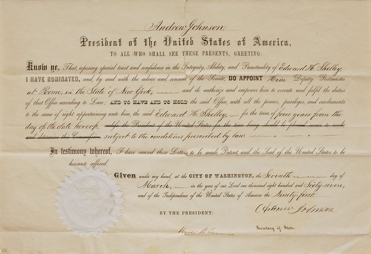 Partly-printed DS as president, one page, 17 x 11.5, March 7, 1867. President Johnson appoints Edward H. Shelley as "Deputy Postmaster at Rome, in the State of New York." Signed at the conclusion by Johnson, and countersigned by Secretary of State William H. Seward. White seal remains affixed to lower left. In fine condition, with some splitting along intersecting folds. Pre-certified PSA/DNA.