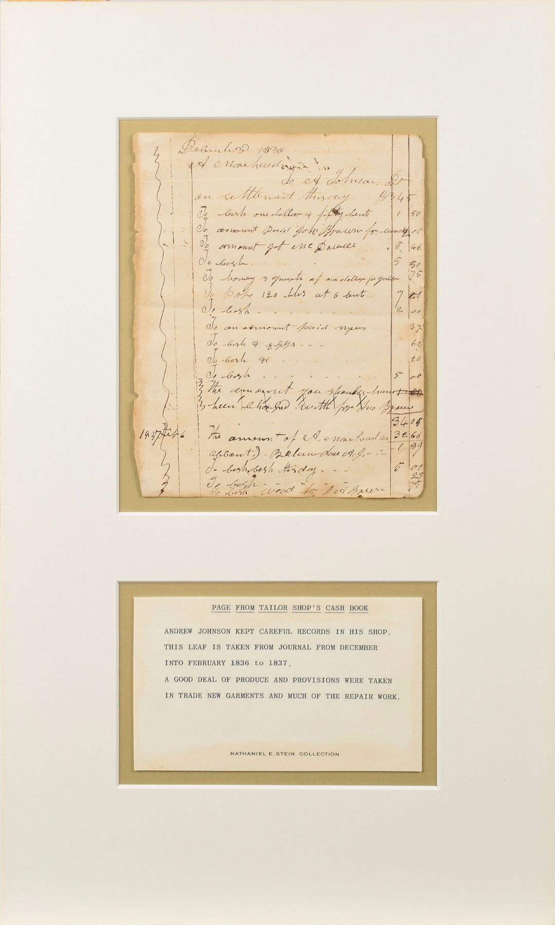 Third-person ADS, signed within the text, "Andrew Johnson" and "A. J.," one page, 6 x 7.75, December 1836–February 1837. A sheet from the ledger of Johnson's tailor shop, being an account of his indentured servant Alexander Morehead. The document is headed, "December 30, 1836. A. Morehead. To A. Johnson…on settlement this day, $3.45…amount paid John Brown for wood, 2.00…Honey 3 quarts at one dollar per gallon .75…pork 120 lbs at 6 cent 7.20…cash & eggs .62…The amount of A. Morehead on account, balance due A. J. 1.39." Mounted and matted with a "Nathaniel E. Stein Collection" card to an overall size of 11.75 x 19.5. In fine condition, with marginal toning and light chipping. Johnson penned this ledger page at just 28 years old while operating his own tailor shop. He had begun his political career a few years earlier, having been elected as town alderman in 1829, and then moved on to the Tennessee House of Representatives in 1835. According to an 1835 contract for indentured servitude, Morehead would work as a tailor in Johnson's Greeneville shop while Johnson made trips to Nashville for his duties as a representative. An outstanding, early autograph from the future president.