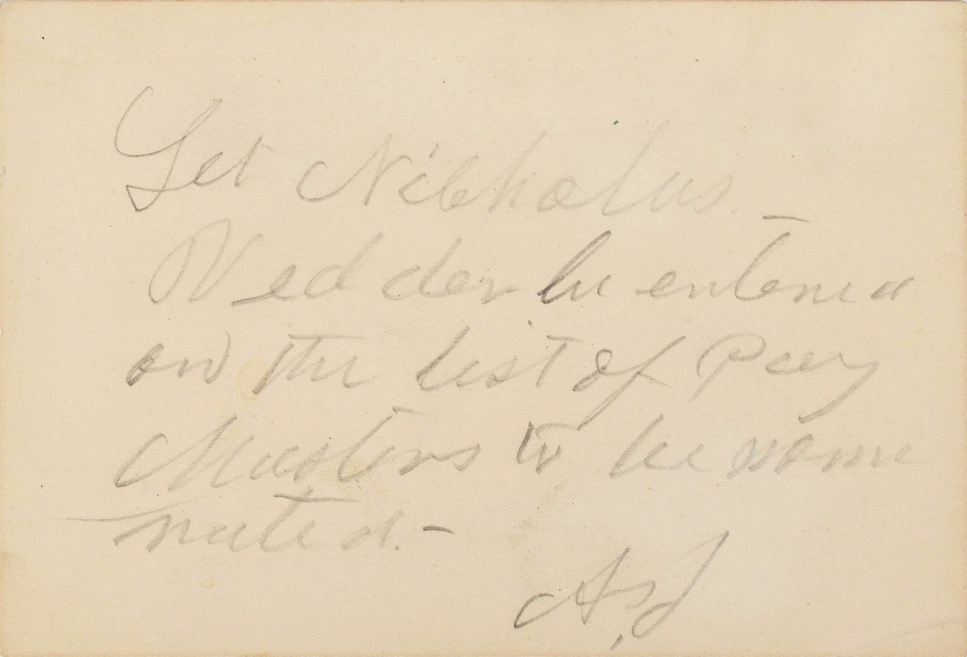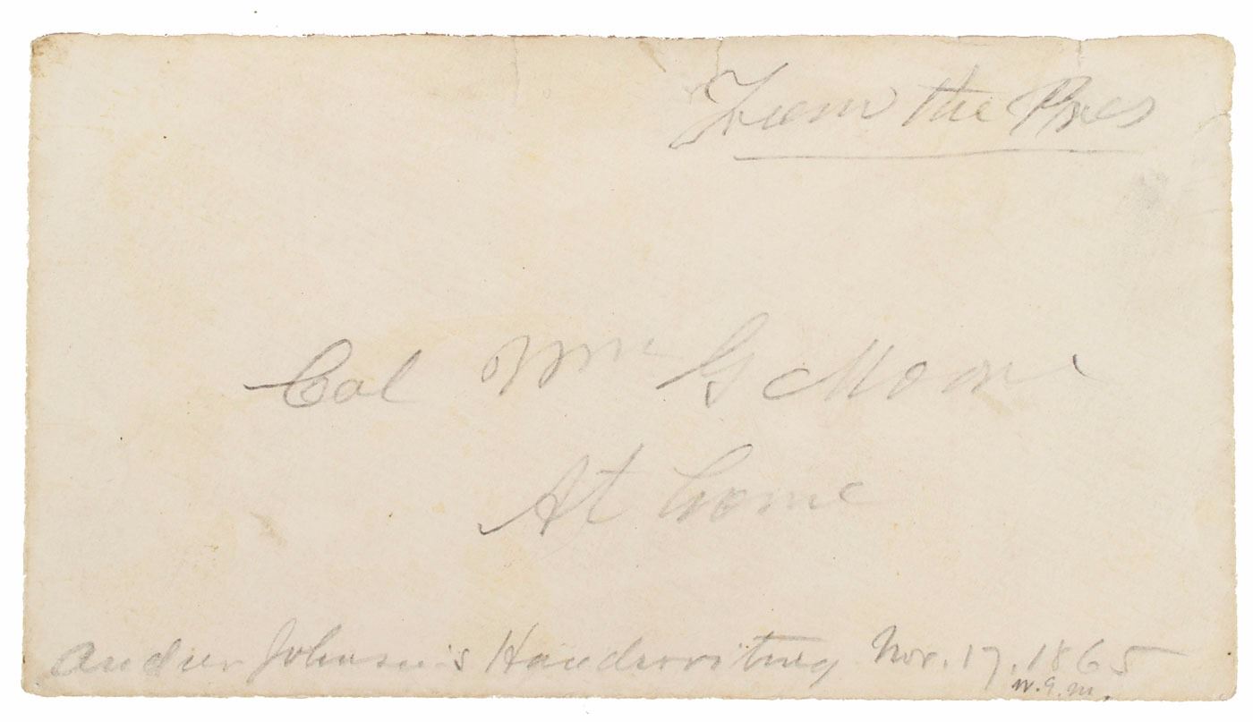 ANS as president signed “A. J.,” on an off-white 3.75 x 2.5 card, no date but 1865. Brief note to Colonel William G. Moore, in full: "Let Nicholas Vedder be entered on the list of Pay Masters to be nominated." Includes the original hand-addressed and free franked mailing envelope, 5 x 2.75, addressed by Johnson to "Col. Wm. G. Moore, At home," and franked in the upper right, "From the Pres." Moore adds along the bottom edge, "Andrew Johnson's handwriting, Nov. 17, 1865." In very good to fine condition, with light soiling and old mounting traces to the reverse of both.