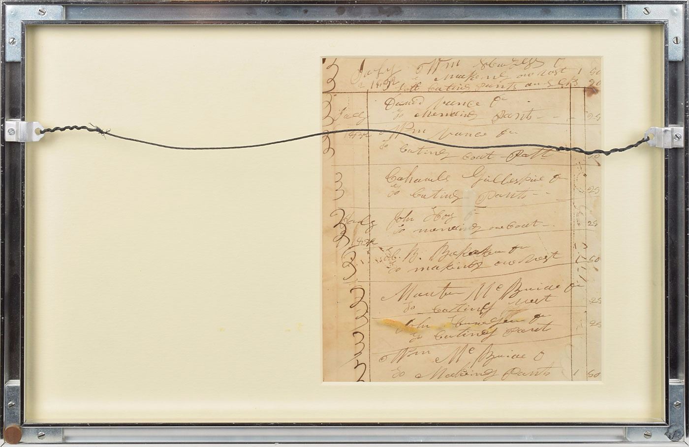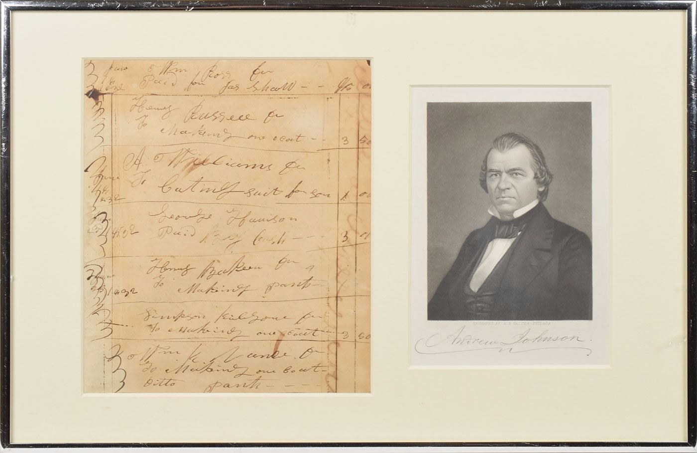 Autograph manuscript, unsigned, one page both sides, 7 x 8.25, June and July 1832. A sheet from the ledger of Johnson's tailor shop, in part: “Henry Russell Dr, Making one o coat 3.50,” “A Williams Dr, Cuting suit for Son 1.00,” “Henry Bakeen Dr, Making pants,” “Simpson Kilgore Dr, Making one coat 2.50,” “Cahamle Gillespie Dr, Cuting pants .25,” “John Hoy Dr, mending one Coat,” and “H.B. Bakette Dr, making one vest 1.50.” Matted and framed with an engraving bearing a preprinted signature to an overall size of 17.25 x 11.25, with a window on the frame backing for viewing the reverse. In fine condition. Johnson penned this ledger page at just 23 years old while operating his own tailor shop. He began his political career a few years later when he was elected as town alderman in 1829, and then moved on to the Tennessee House of Representatives in 1835.