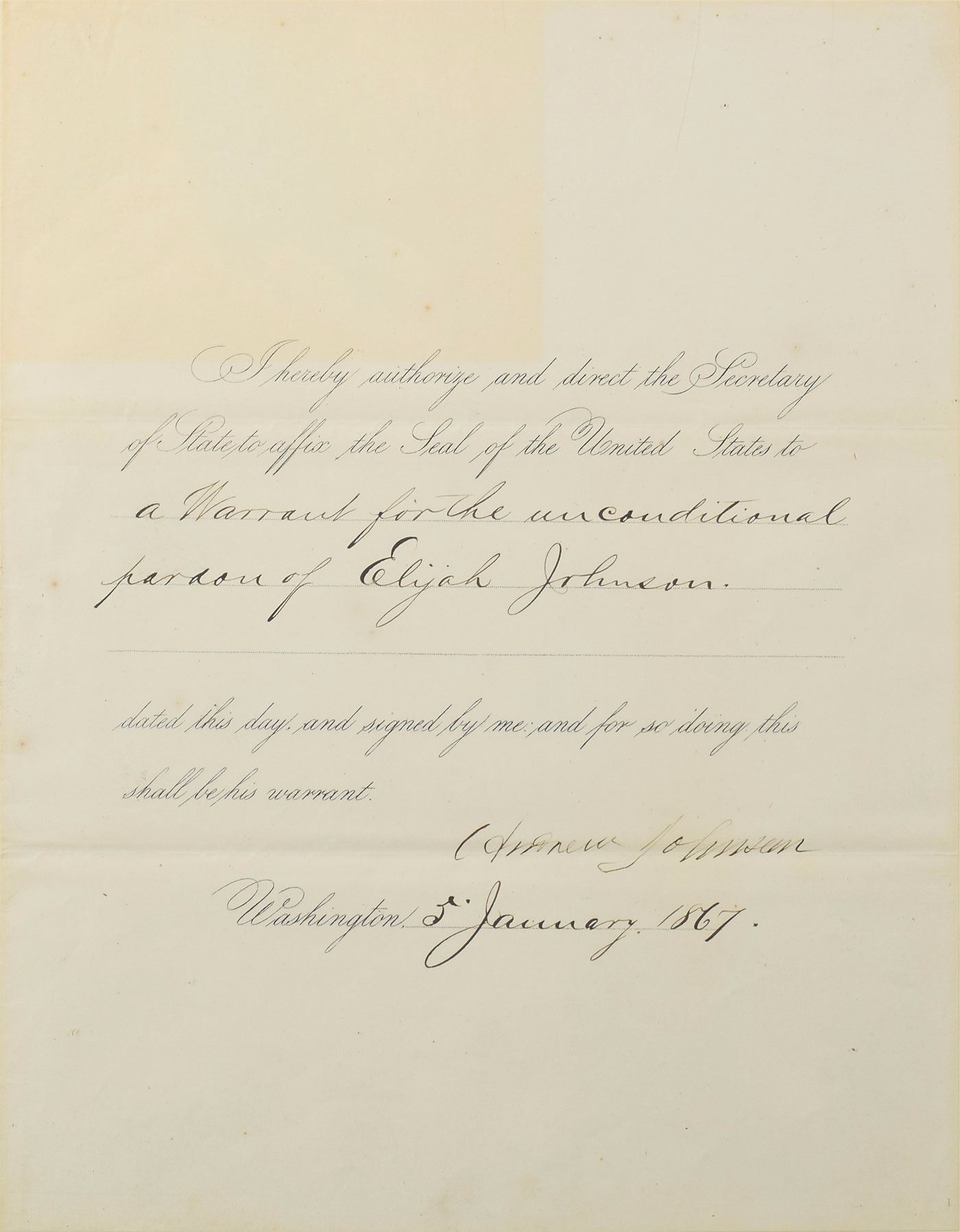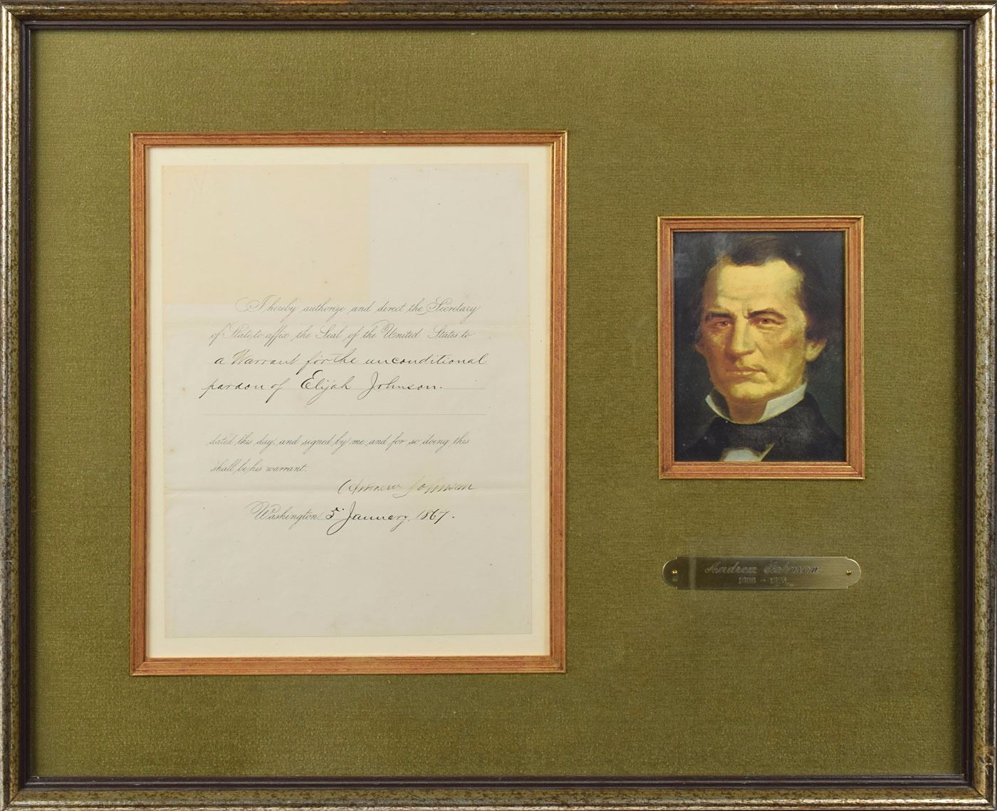 Partly-printed DS, one page, 8.5 x 10.75, January 5, 1867. President Johnson authorizes and directs the secretary of state to "affix the Seal of the United States to a Warrant for the unconditional pardon of Elijah Johnson." Signed at the conclusion by Johnson. Attractively mounted and framed with a portrait of Johnson to an overall size of 22.75 x 18.5. In fine condition.