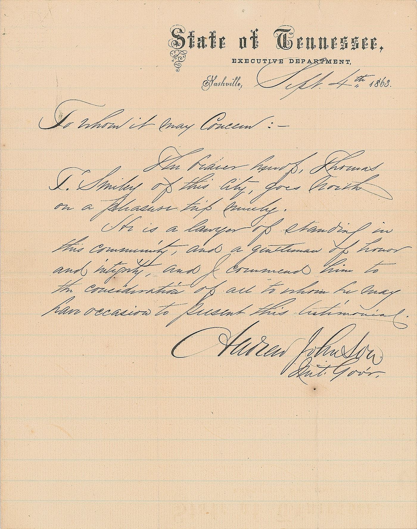 Secretarially-signed Civil War–dated letter, one page, 7.75 x 9.75, State of Tennessee, Executive Department letterhead, September 4, 1863. In full: "The bearer hereof, Thomas T. Smiley of this city, goes North on a pleasure trip…He is a lawyer of standing in this community, and a gentleman of honor and integrity, and I commend him to the consideration of all to whom he may have the occasion to present this testimonial." In fine condition.