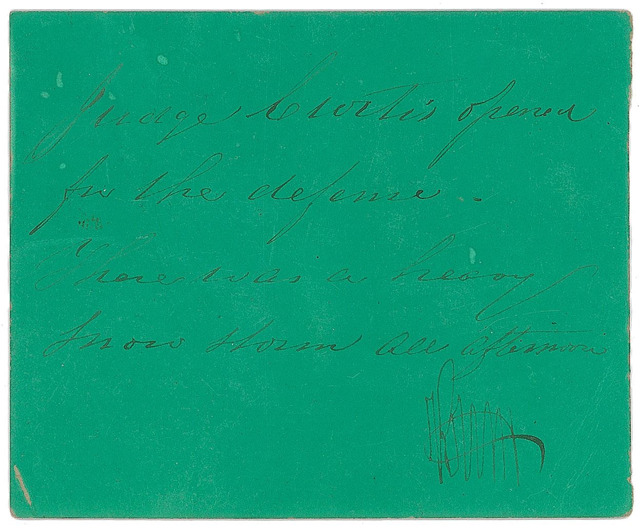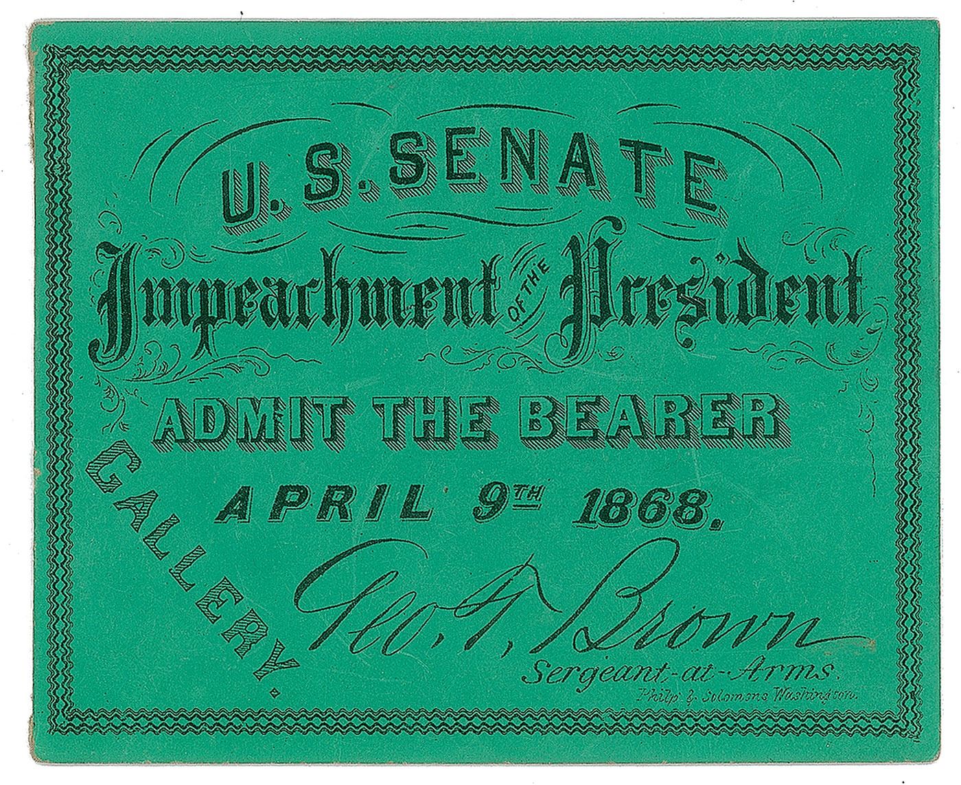 Original 3.5 x 3 green gallery ticket stub to the US Senate Impeachment of President Andrew Johnson on April 9, 1868. Reverse bears a notation from a spectator, "Judge Curtis opened for the defense. There was a heavy snow storm all afternoon." In fine condition.