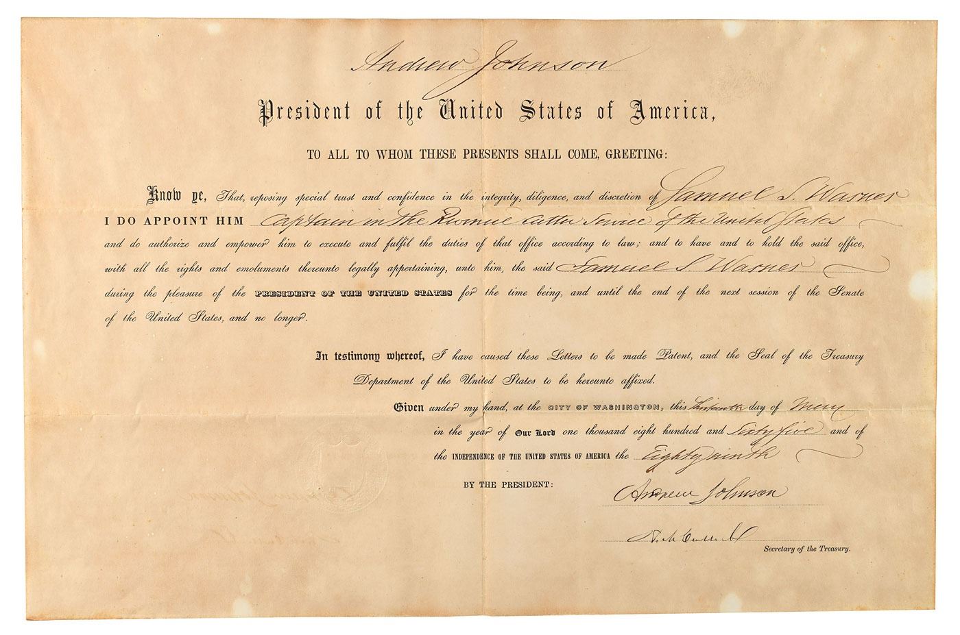 Partly-printed DS as president, one page, 16.75 x 11, May 13, 1865. Four weeks into his term in office, President Johnson appoints Samuel S. Warner as "Captain in the Revenue Cutter Service of the United States." Crisply and boldly signed at the conclusion by President Andrew Johnson, and countersigned by Secretary of the Treasury Hugh McCulloch. In very good to fine condition, with somewhat mottled overall toning.
