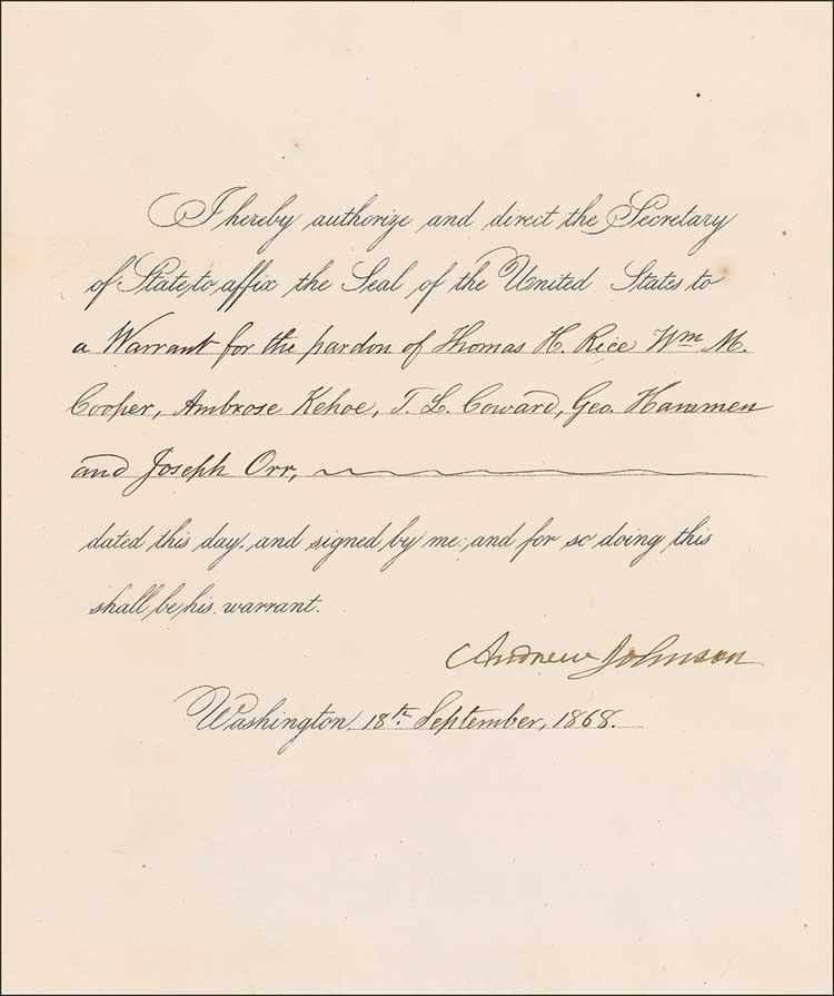 Partly-printed DS as president, one page, 8 x 10, September 18, 1868. President Johnson orders “the Secretary of State to affix the Seal of the United States to a Warrant for the pardon of Thomas H. Rice, Wm. M. Cooper, Ambrose Kehoe, T. L. Coward, Geo. Hammen and Joseph Orr.” In fine condition, with a uniform shade of light toning, a slight brush to signature, and a bisecting horizontal fold through signature. Pre-certified John Reznikoff/PSA/DNA and RRAuction COA.
