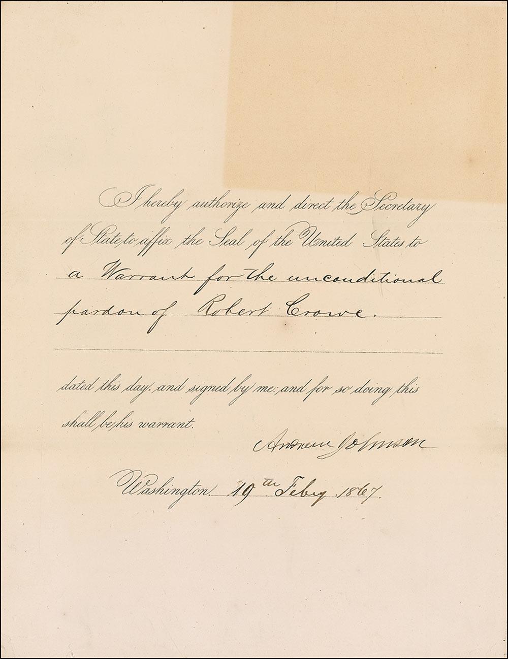 Partly-printed DS as president, one page, 8 x 10, February 19, 1867. President Johnson orders the Secretary of State to “affix the Seal of the United States to a Warrant for the unconditional pardon of Robert Crowe.” In fine condition, with a horizontal fold through signature, and a block of toning to top right blank area. Pre-certified John Reznikoff/PSA/DNA and RRAuction COA.