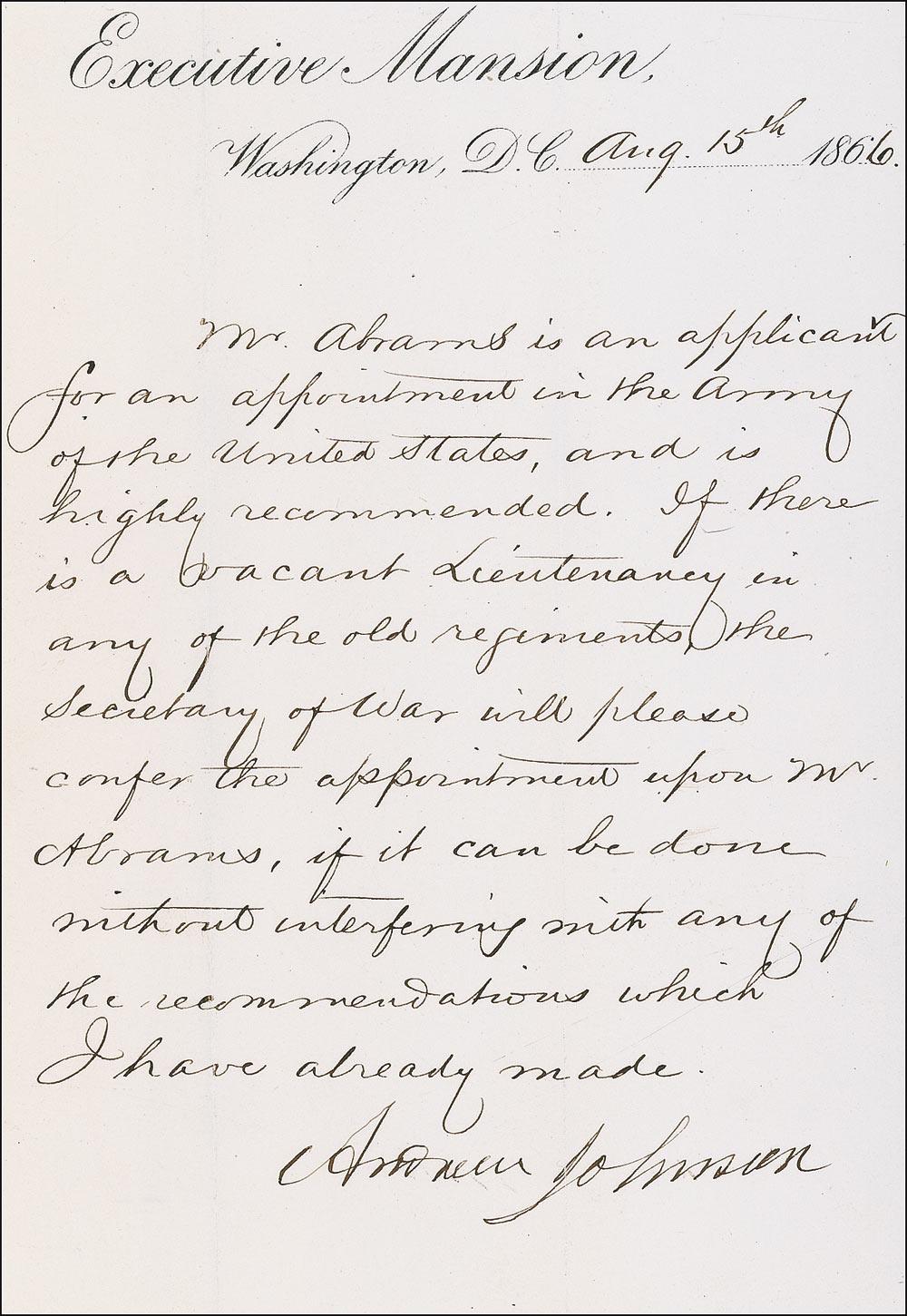 LS as president, one page, 4.75 x 7, Executive Mansion letterhead, August 15, 1866. Letter to an unknown recipient, most likely his Secretary of War. In full, “Mr. Abrams is an applicant for an appointment in the Army of the United States, and is highly recommended. If there is a vacant Lieutenancy in any of the old regiments, the Secretary of War will please confer the appointment upon Mr. Abrams, if it can be done without interfering with any of the recommendations which I have already made.” In fine condition, trimmed in size, with two vertical mailing folds, one through a single letter of signature, and lightly trimmed edges.