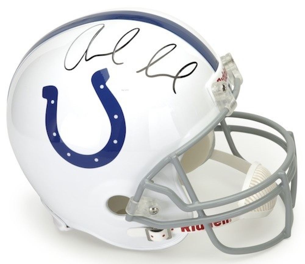 Riddell full-size authentic on-field helmet has been hand-signed in black felt-tip pen by Andrew Luck.
