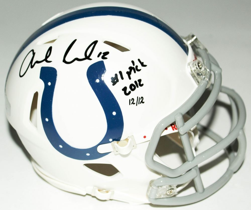 Indianapolis Colts mini speed helmet. Hand-signed and inscribed in black felt-tip pen by Andrew Luck. Mini-helmet is limited edition and has been hand-numbered #12/12.