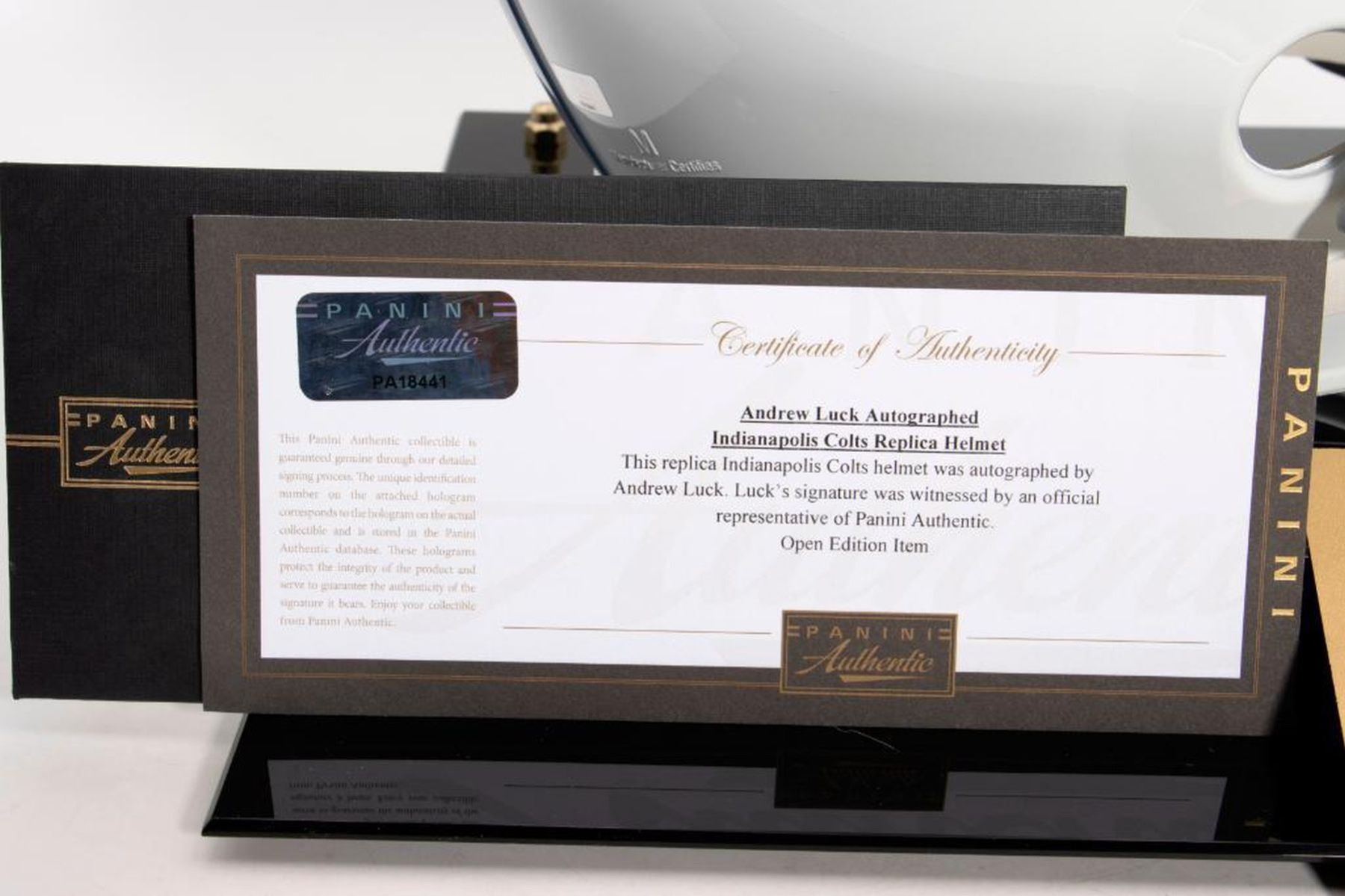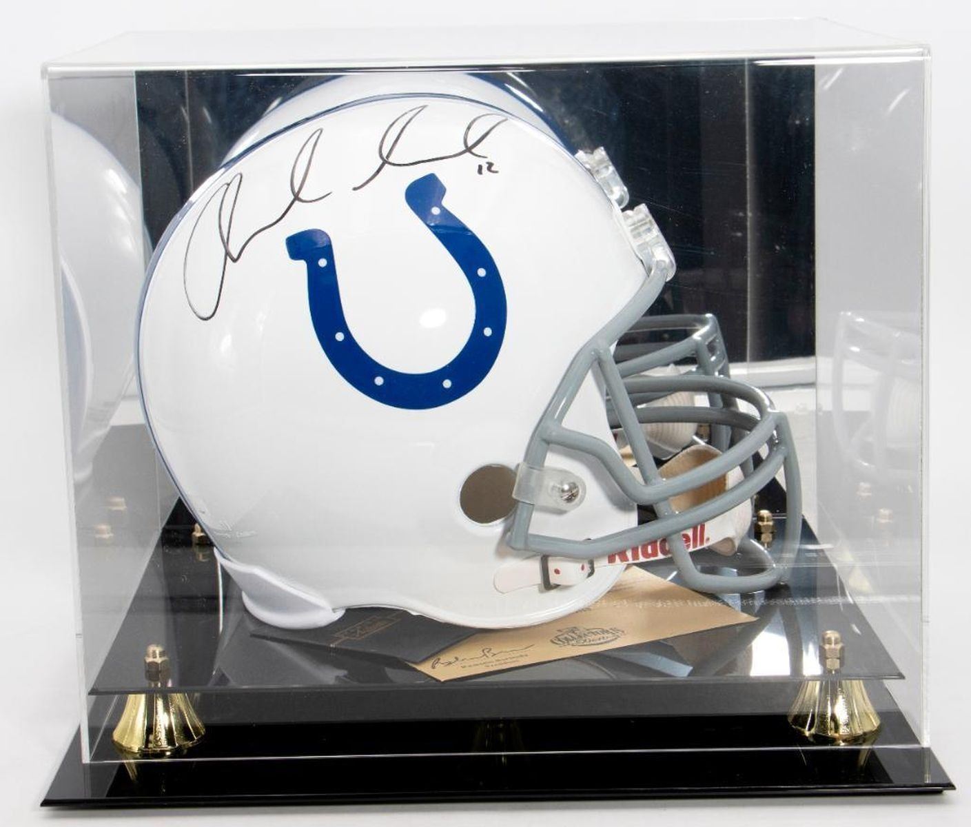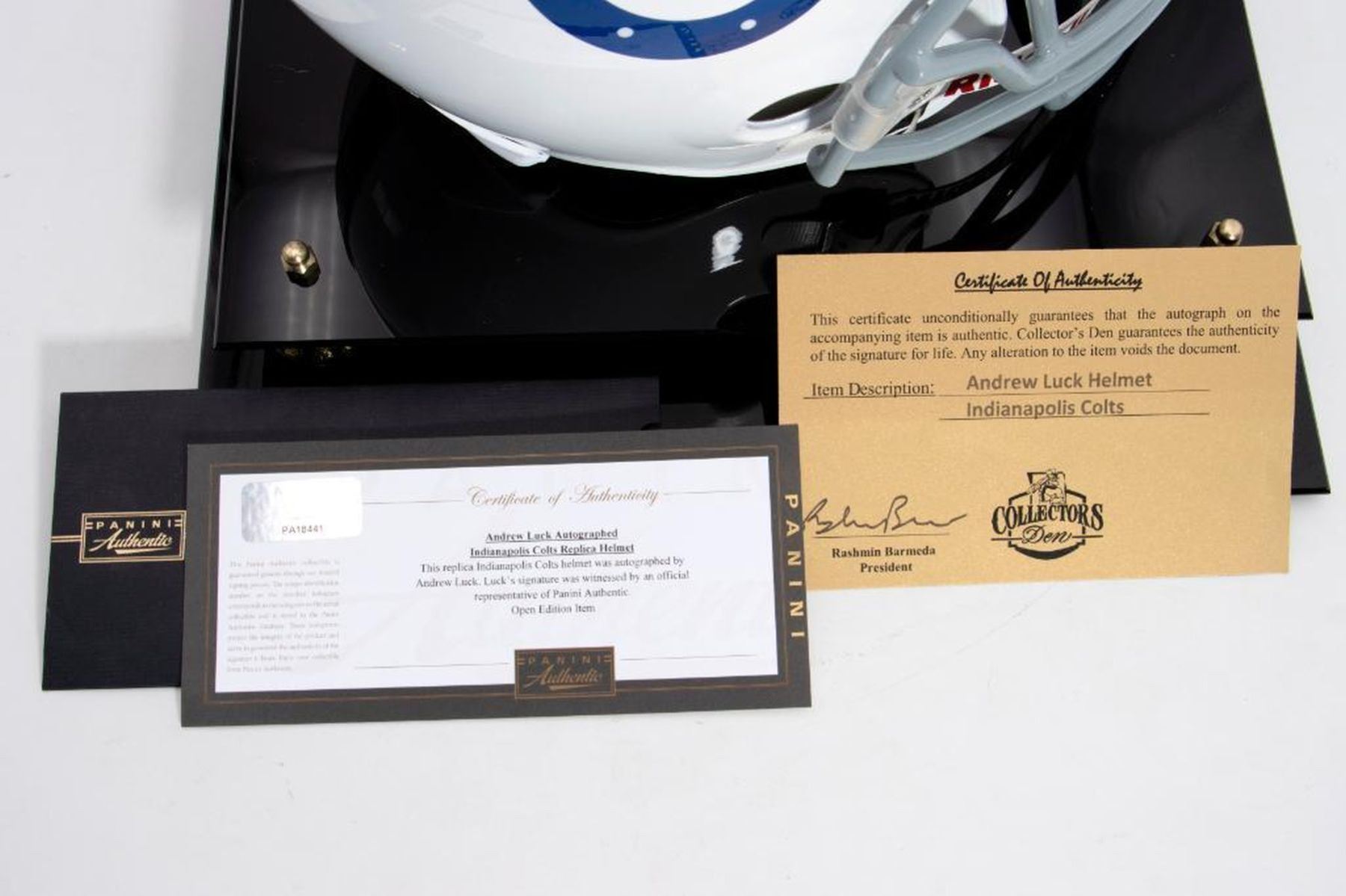 Cased Andrew Luck Signed Indianapolis Colts Full Size Pro helmet. H: 12 inches W: 14.5 inches Depth: 12.9 inches